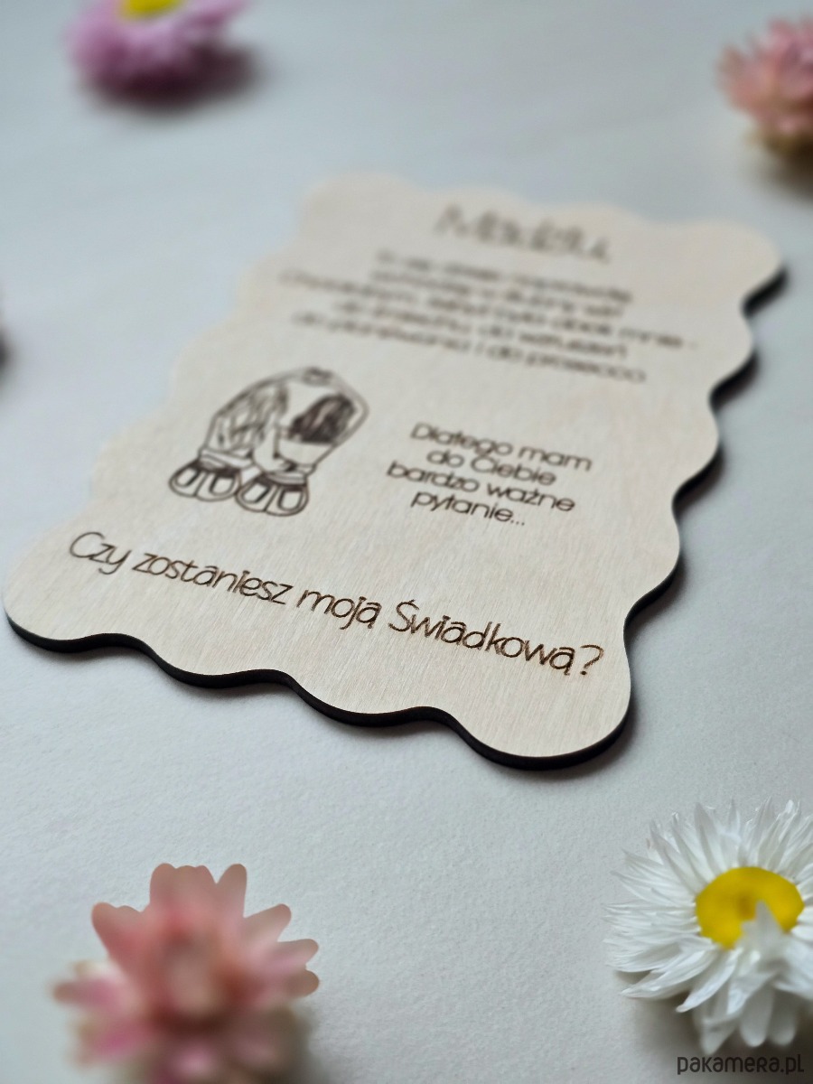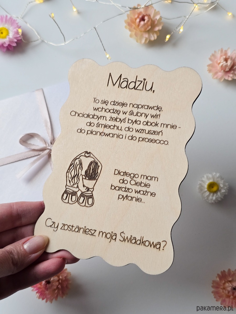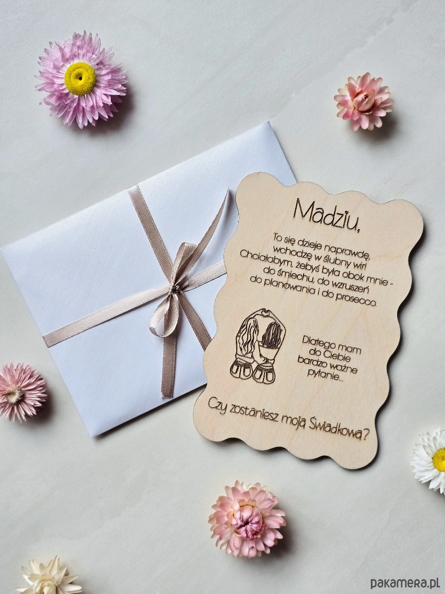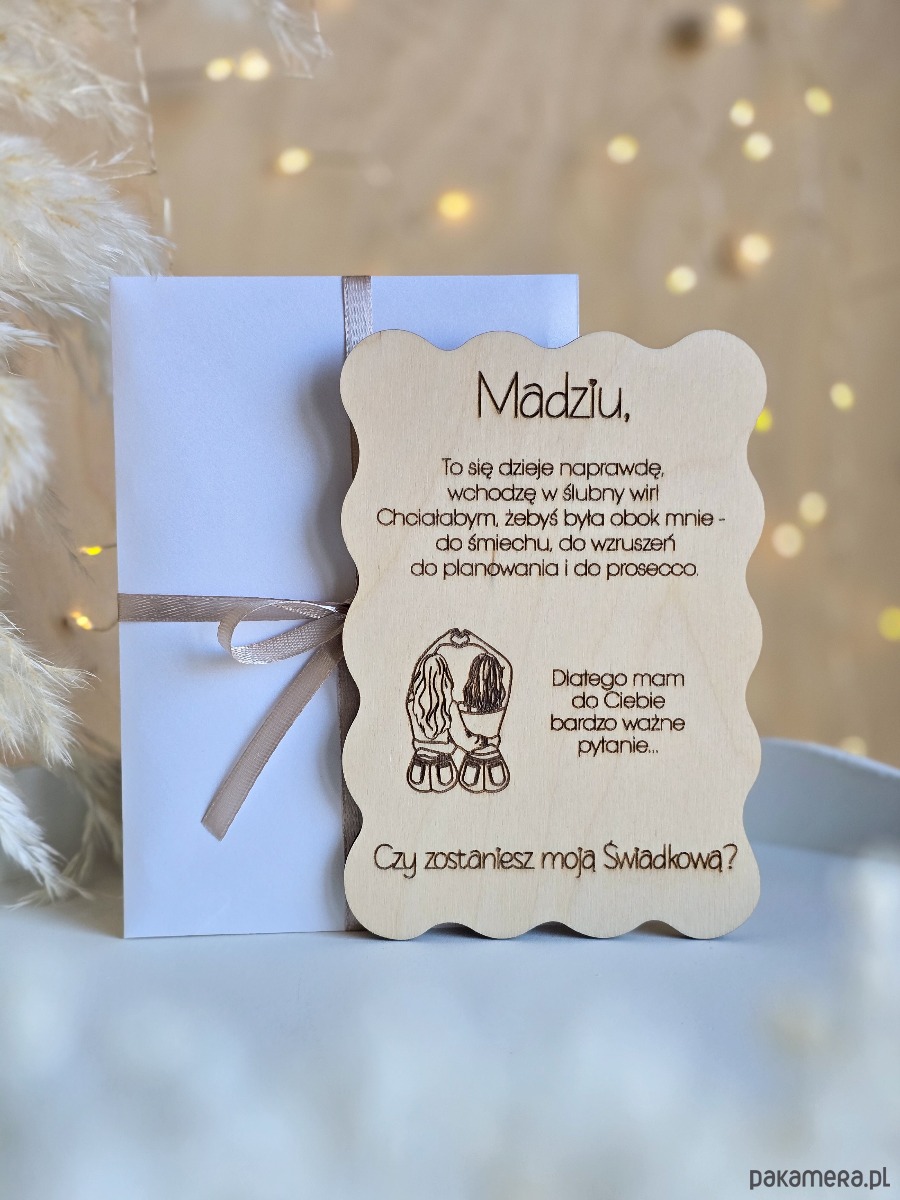 Jeśli przed Tobą proszenie przyjaciółki, siostry lub innej bliskiej osoby o świadkowanie, ta kartka powstała właśnie na ten moment. To falowana kartka ze sklejki z personalizowanym grawerem, zapakowana w elegancką, połyskującą kopertę - gotowa do wręczenia.