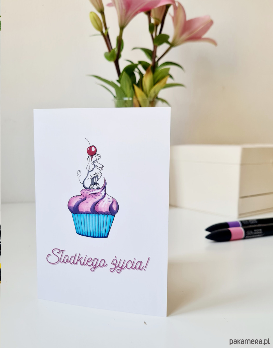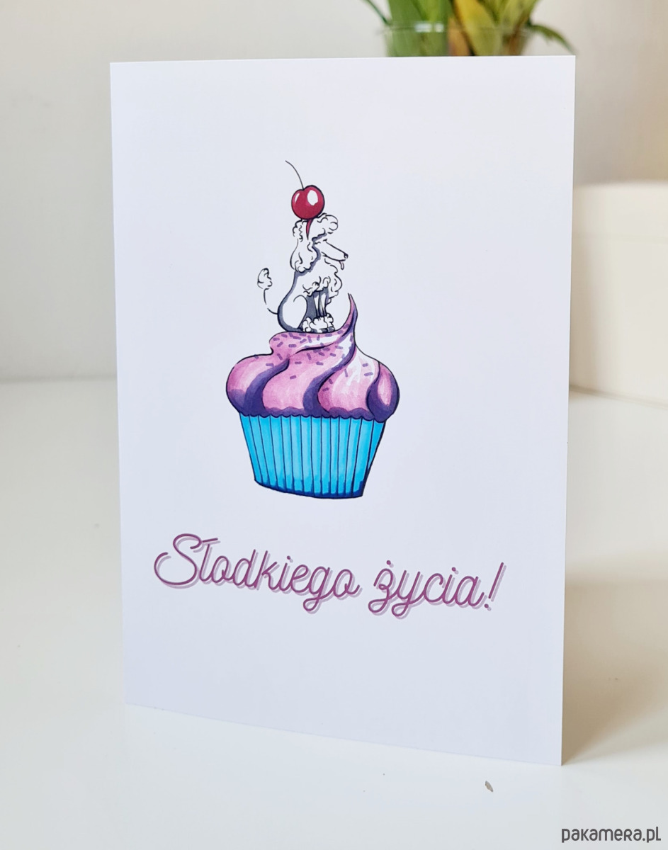 Słodki biały pudelek już siedzi na mufince, by razem z Tobą świętować szczególną okazję. Ta kartka to uroczy i uniwersalny upominek na każdą okazję, np. urodziny i imieniny, ślub, prezent pożegnalny - zawsze, gdy chcesz życzyć komuś słodkiego życia.