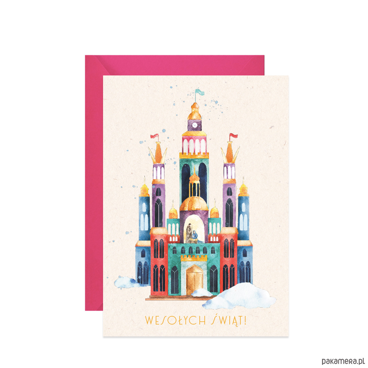 Kartka z akwarelową szopką krakowską. Doskonale sprawdzi się w roli karty na najserdeczniejsze życzenia na wiele okazji: od zimowych urodzin po Boże Narodzenie.