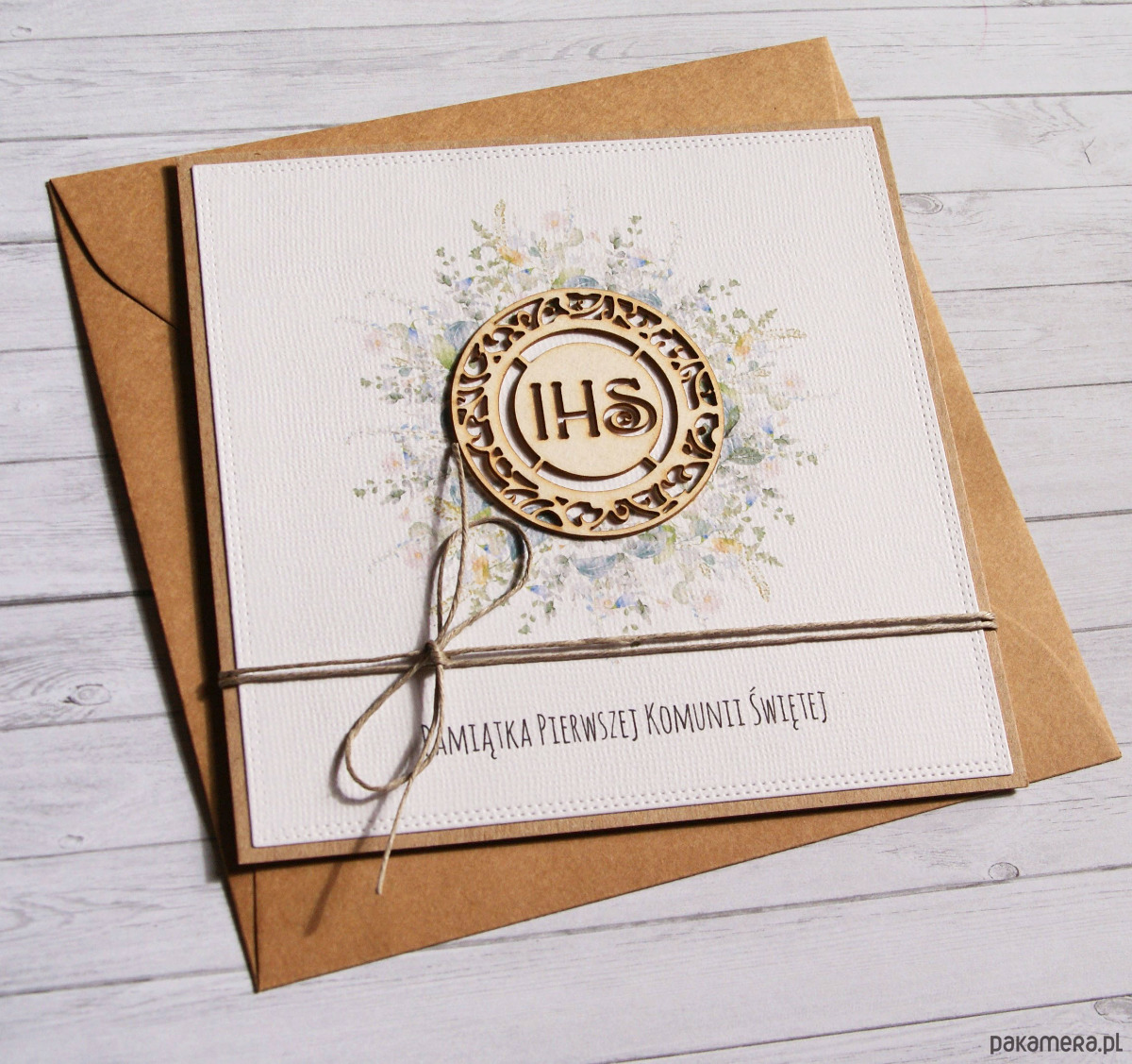 wykonana na bazie grubego kartonu eko-kraft (100% makulatury), ozdobiona papierem wizytówkowym z fakturą płótna (z nadrukiem), ozdobiona ażurową tekturką z beermaty; przewiązana naturalnym sznurkiem.