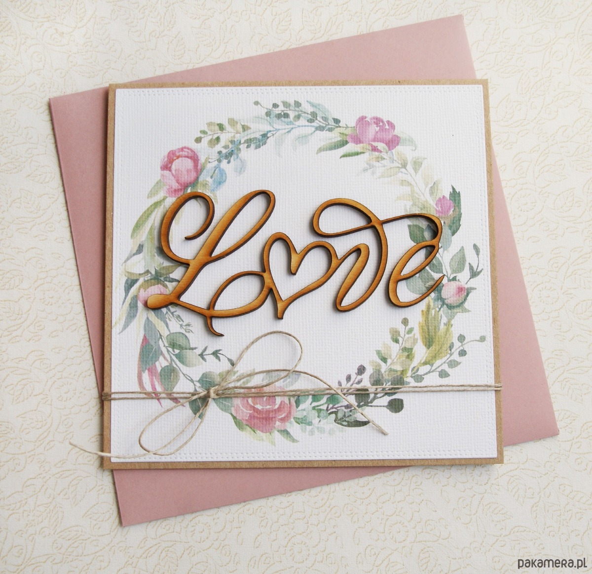 cudna kartka ślubna wykonana na bazie grubego kartonu EKO-kraft (100% makulatury), ozdobiona najwyższej jakości papierem wizytówkowym (faktura płótna) z drukowanym wzorem. w centrum: drewniany napis LOVE. kartka przewiązana naturalnym sznurkiem.