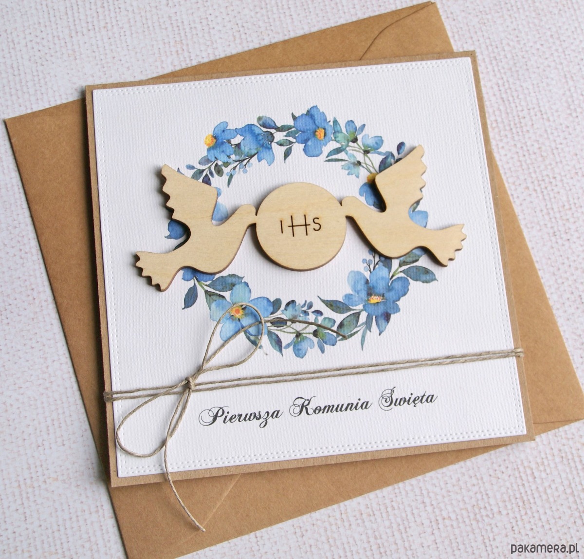 wykonana na bazie grubego kartonu eko-kraft (100% makulatury), ozdobiona papierem wizytówkowym z fakturą płótna (z nadrukiem), ozdobiona drewnianym elementem; przewiązana naturalnym sznurkiem.