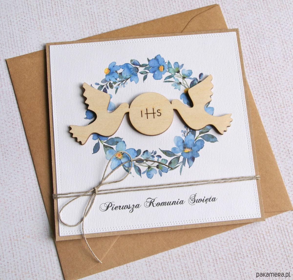 Kartka z życzeniami : I Komunia Święta : niebieska : gołębie ihs