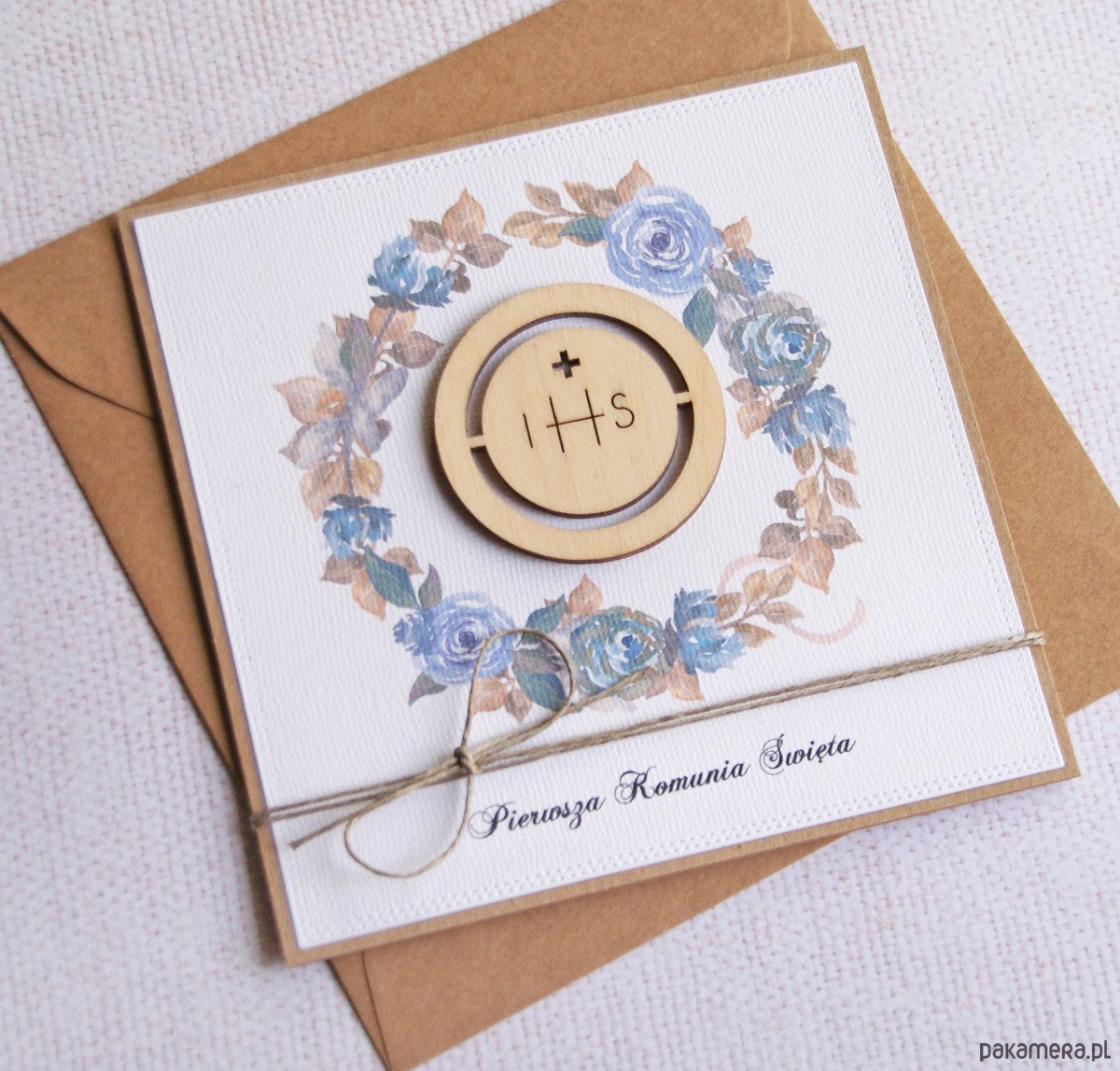 wykonana na bazie grubego kartonu eko-kraft (100% makulatury), ozdobiona papierem wizytówkowym z fakturą płótna (z nadrukiem), ozdobiona drewnianym elementem; przewiązana naturalnym sznurkiem.