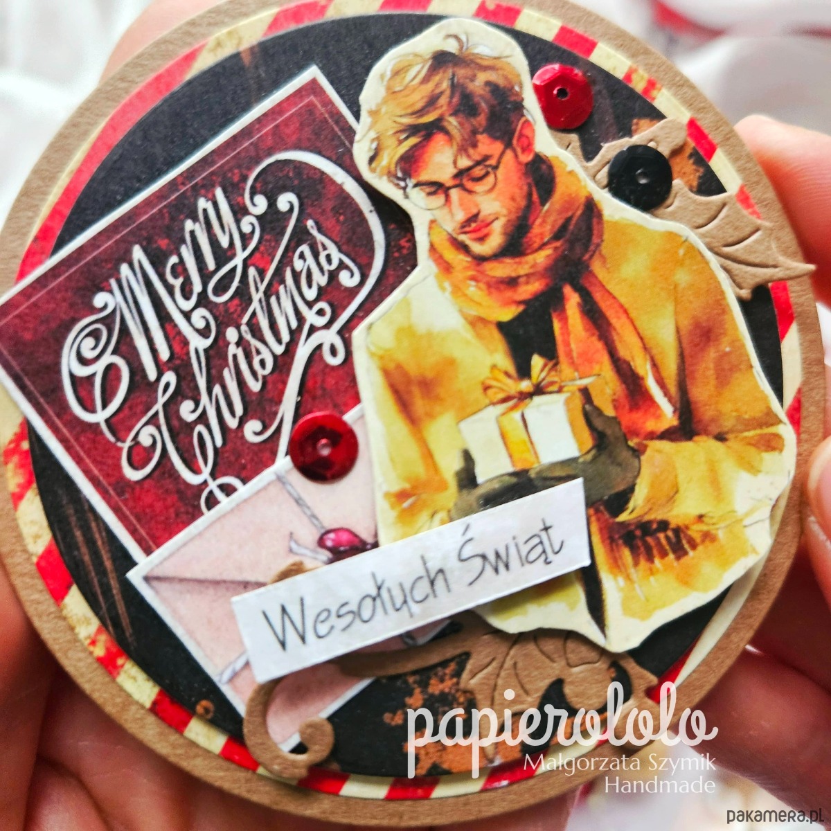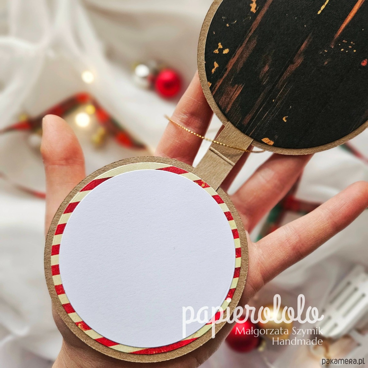 Kartka na bazie kół z miejscem na wypisanie życzeń lub dedykacji. Zawieszkę można użyć do podpisania prezentu lub, aby wysłać jako kartkę. Zawieszka potem może wisieć na choince jak bombka.
