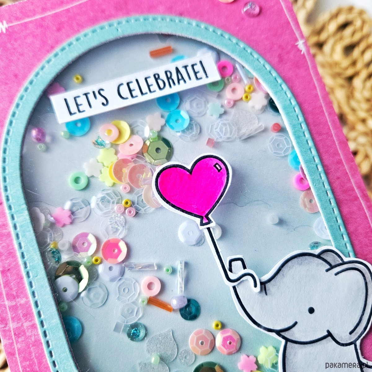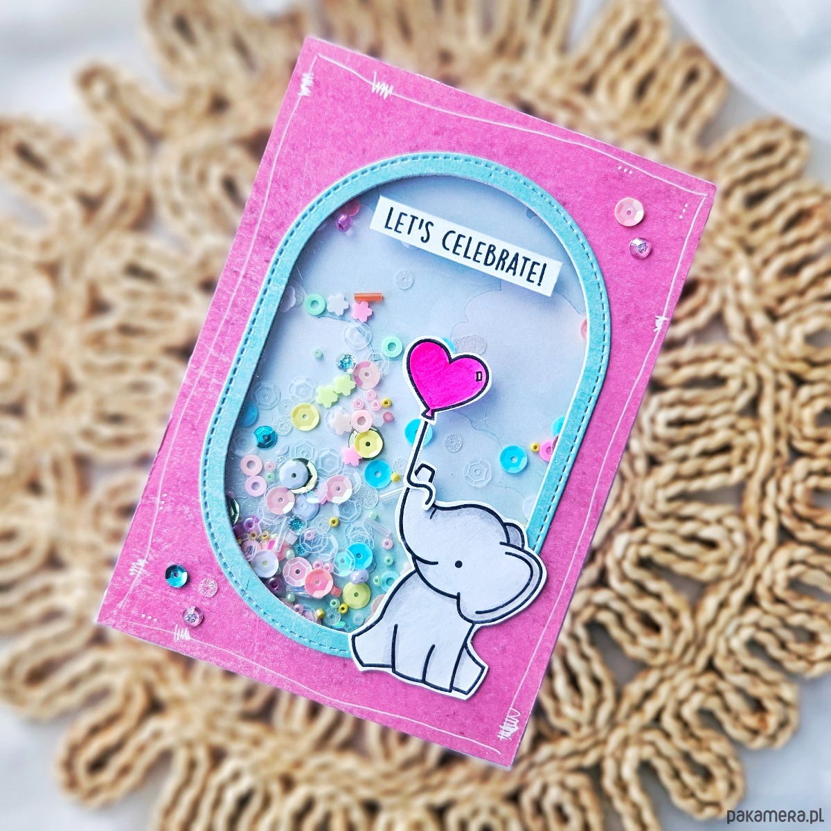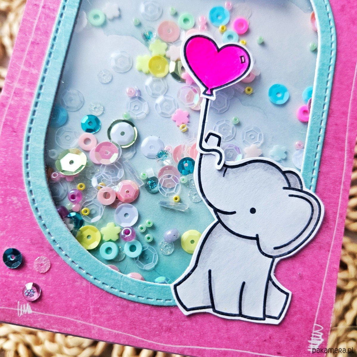 Ta urocza karteczka ma na przodzie element tzw. shaker, czyli okienko z poruszającymi się drobinkami, cekinami i innymi szeleszczącymi dodatkami. Dzięki temu podczas poruszania kartką przyjemnie szeleści przypominając grzechotkę. Na przodzie jest słonik z balonem oraz napis, który może zostać zmieniony.