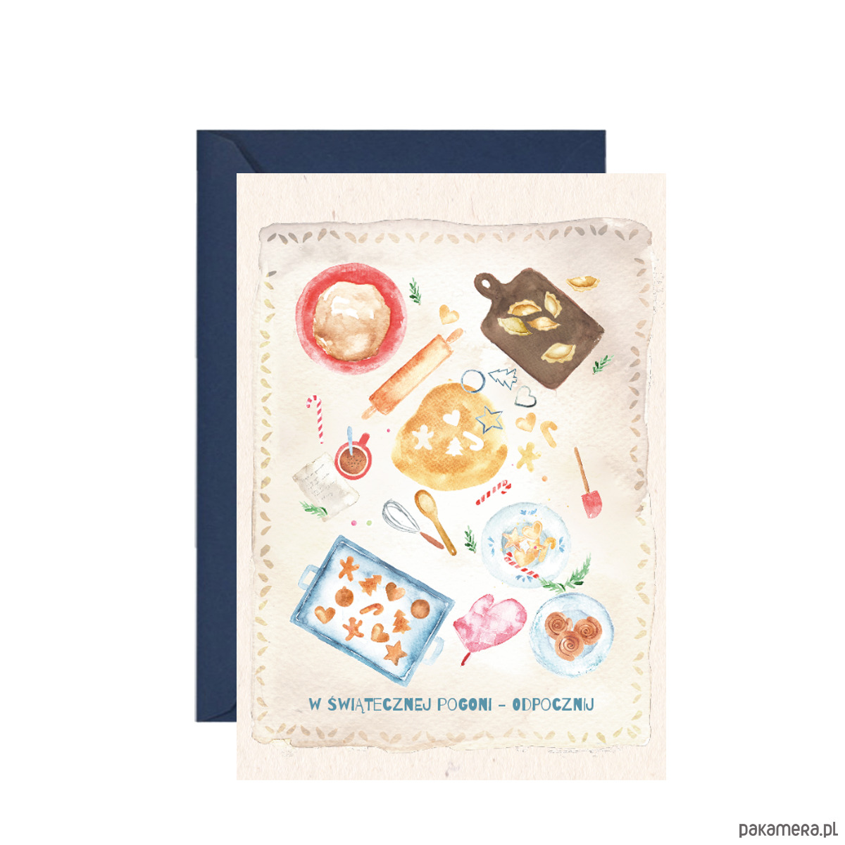 Kartka ze stołem świątecznych przygotowań - pieczemy pierniki, lepimy pierogi i… koniecznie odpoczywamy! Doskonale sprawdzi się w roli karty na najserdeczniejsze życzenia na wiele okazji: od zimowych urodzin po Boże Narodzenie.