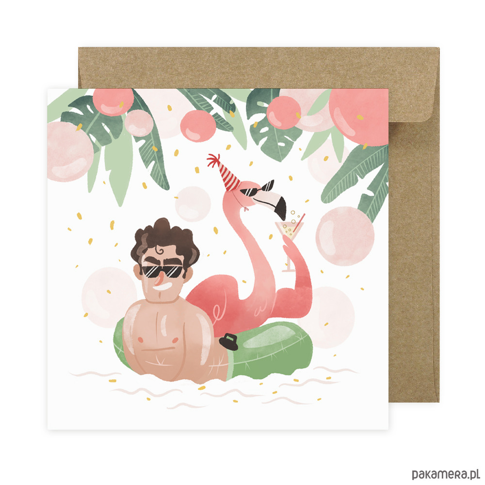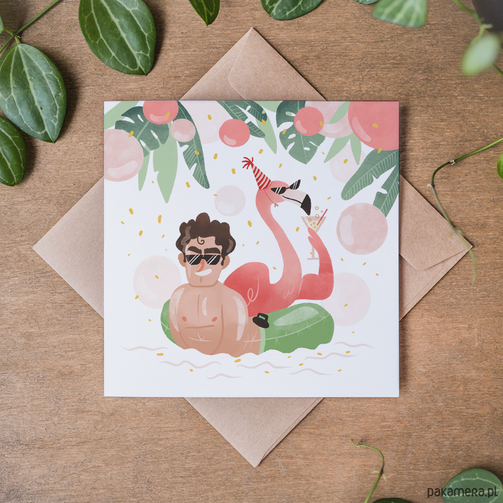 Najbardziej imprezowa kartka w naszej kolekcji! Dla tego flaminga role się odwróciły - teraz on korzysta z życia i popija drinki w basenie. Kartka idealna na urodziny, wieczory panieńskie i inne imprezy, szczególnie z tropikalnym motywem przewodnim!