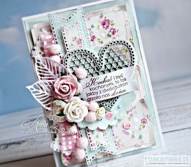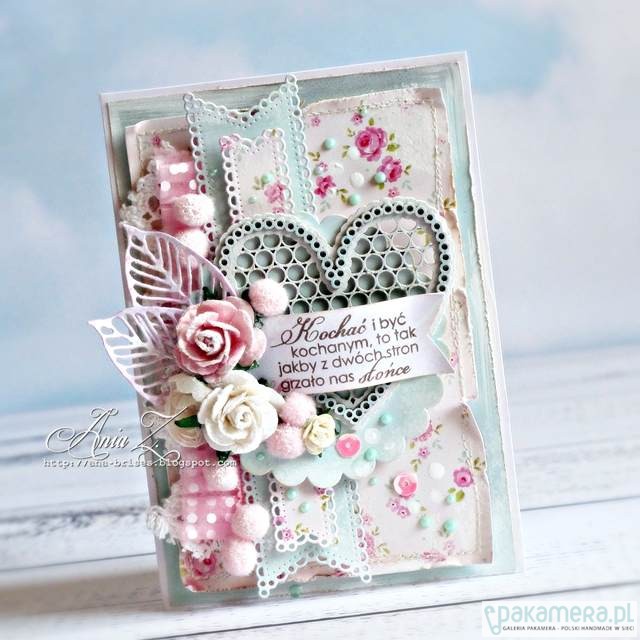 Wyjątkowa, romantyczna kartka, pełna misternych i koronkowych wycinanek oraz ręcznie formowanych kwiatów. Z pewnością zrobi wrażenie na osobie obdarowanej... Kartka w rozmiarze ok. 10,5 x 15 cm, wykonana ręcznie z profesjonalnych materiałów do scrapbookingu, przeszywana, barwnie i warstwowo ozdobiona. W komplecie