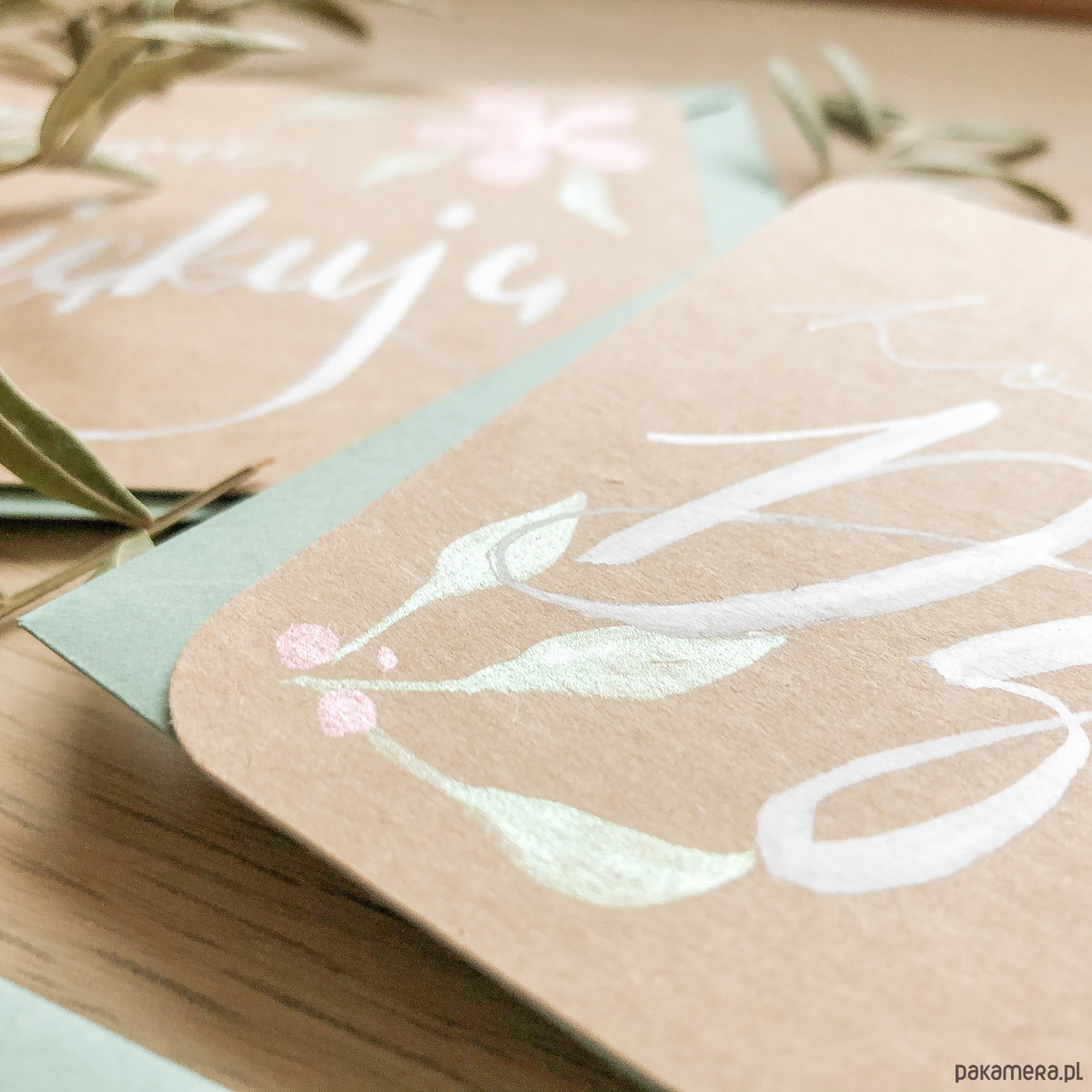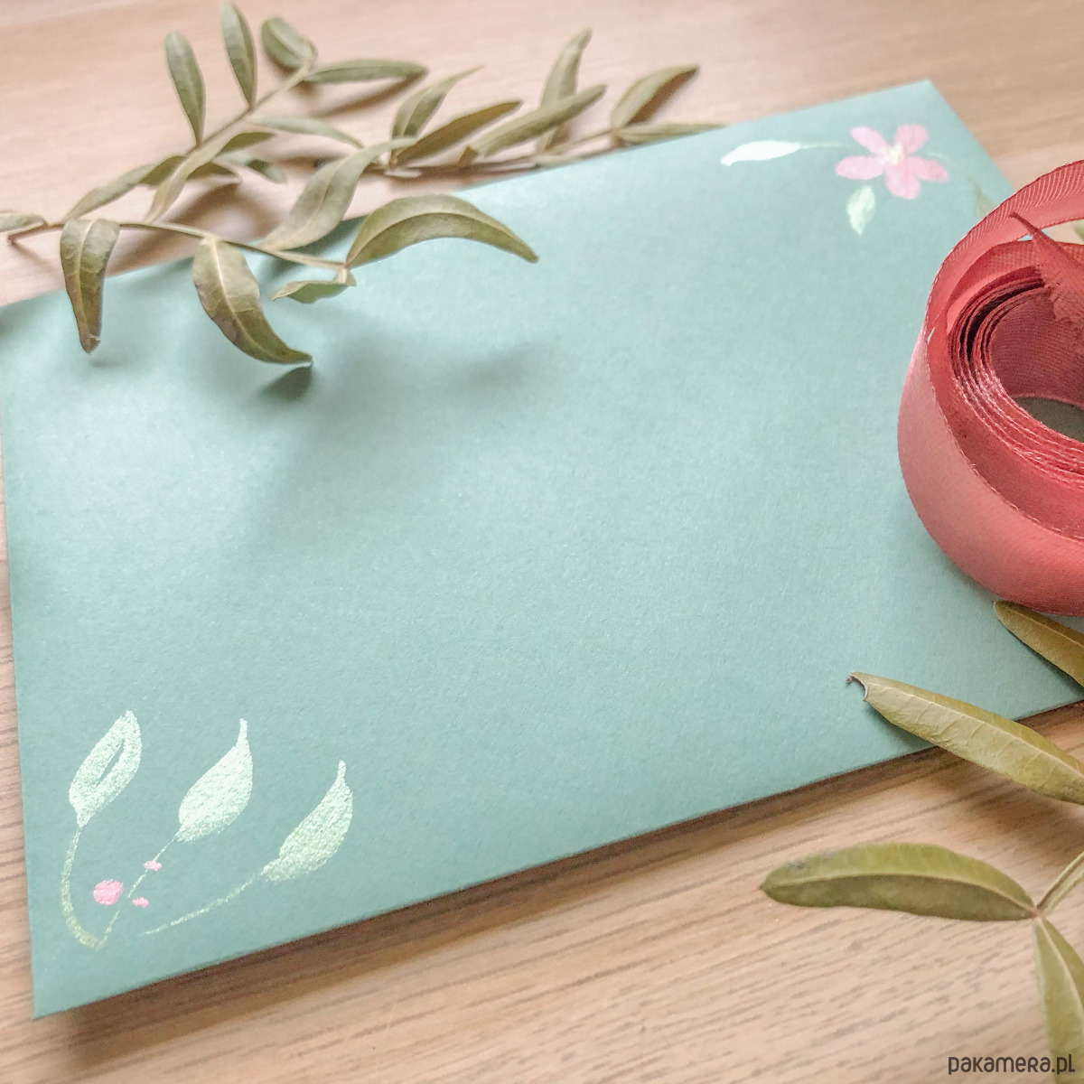 Wysokiej jakości brązowy eko papier o gramaturze 340g, dzięki czemu jest gruby i sztywny. Zdobienia wykonane farbą z pięknym, metalicznym wykończeniem. Pod wpływem światła wszystko mieni się nadając całości prawdziwej magii. Wymiary kartki to 10,5x14,5. Koperta w kolorze Matcha Green formatu C6.