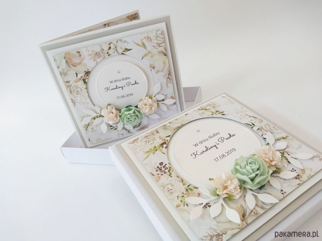 Delikatna kartka ślubna w pudełku w pięknych pastelowych kolorach.
