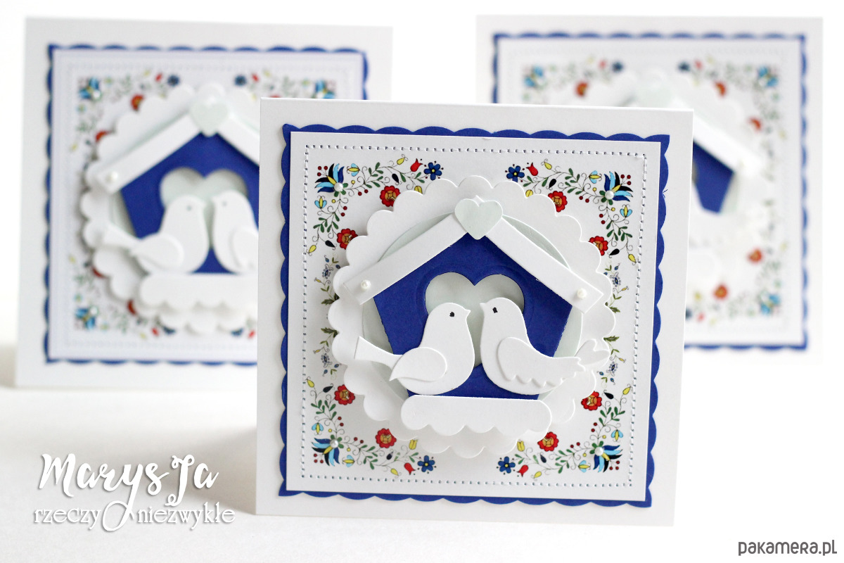 urocza kartka z motywem polskiego, kaszubskiego haftu; wersja z uroczymi zakochanymi ptaszkami; format 14x14cm; możliwość personalizacji - umieszczenie napisu tytułowego; w komplecie z kopertą; wzór