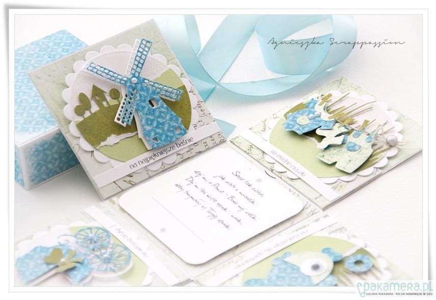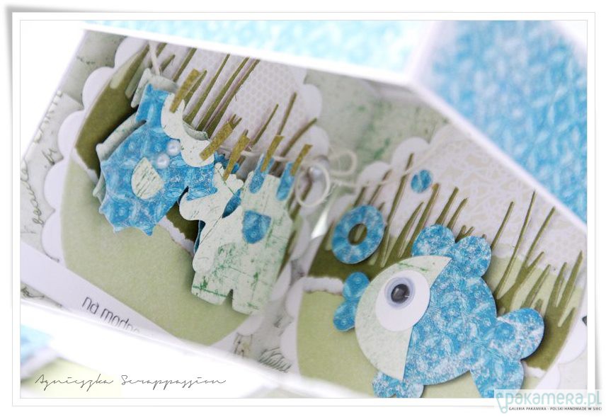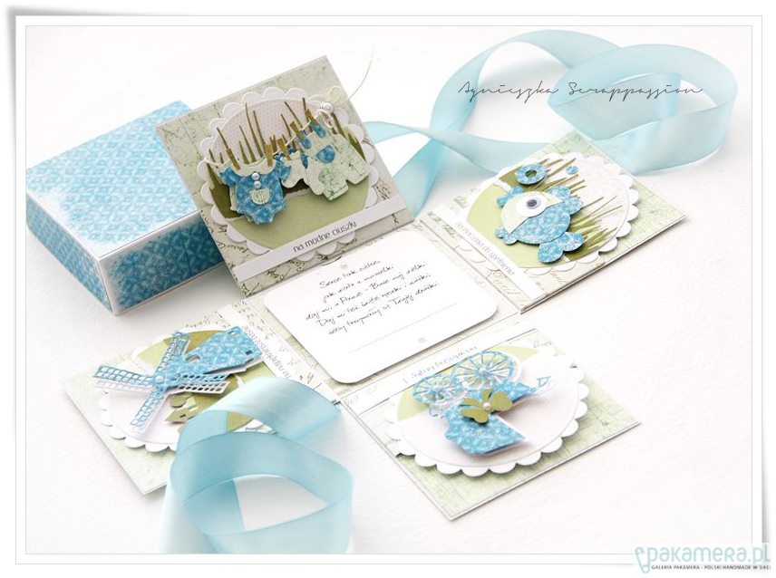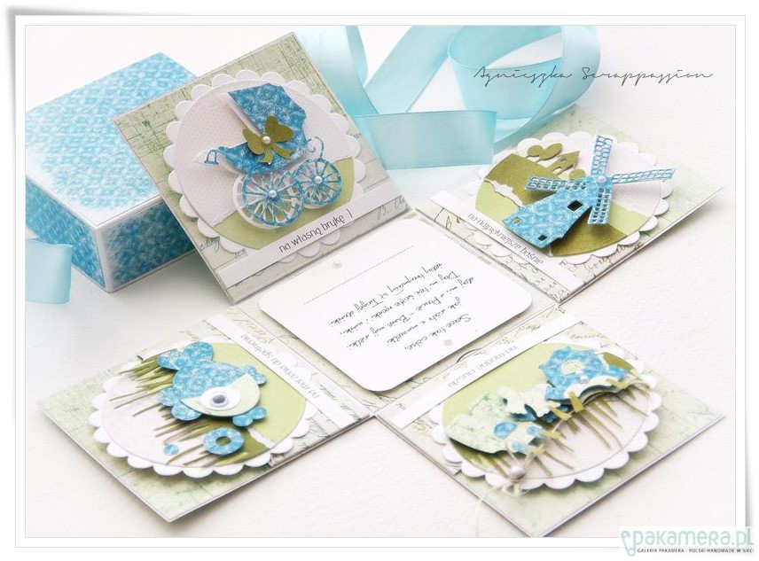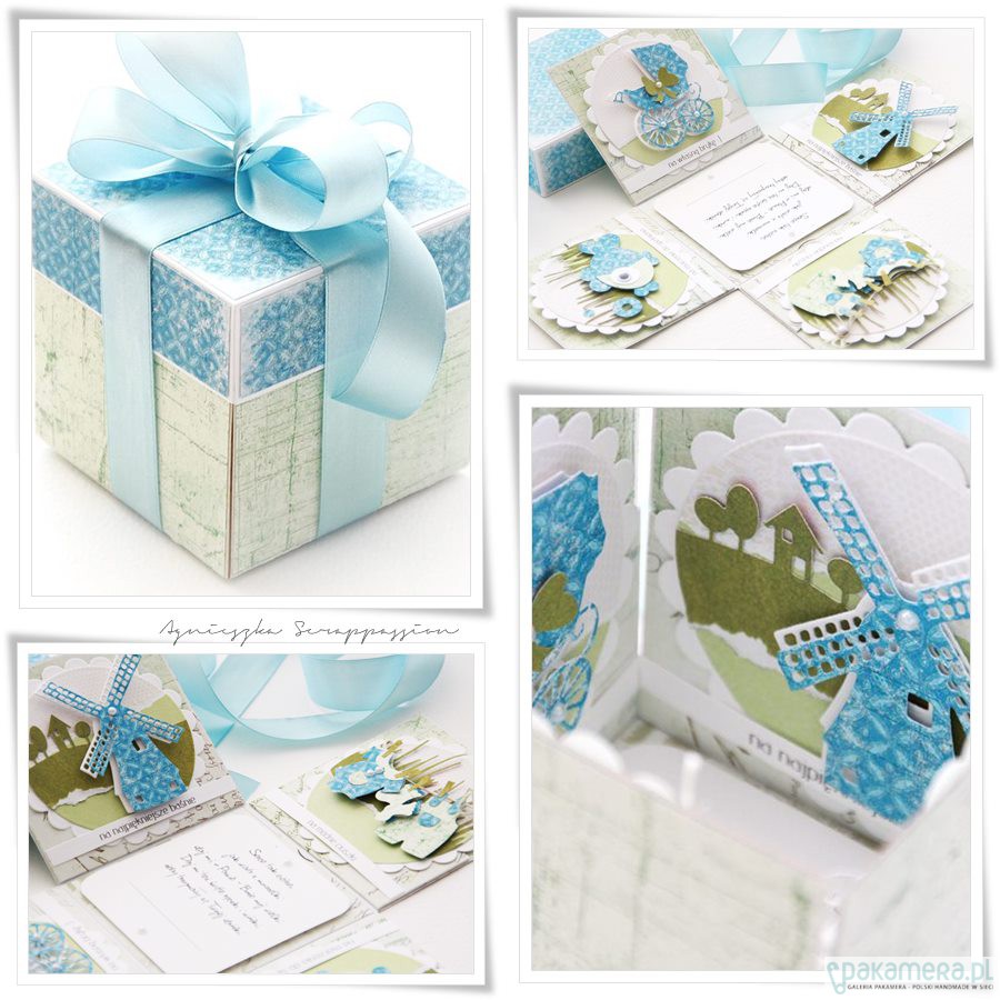 Oryginalne i zabawne ,składane pudełko na chrzest z życzeniami oraz miejscem na własnoręczny podpis .Pudełko w 100 % wykonane ręcznie z dbałością o każdy detal. Wymiary złożonego pudełka to 10/10/10 cm. Po rozłożeniu jego osiąga wielkość 30/30 cm.Pod każdym z obrazków znajduje sie kieszonka na upominek pienięzny, Całość zabezpieczona transparentnym opakowaniem. projekt autorski. wzór