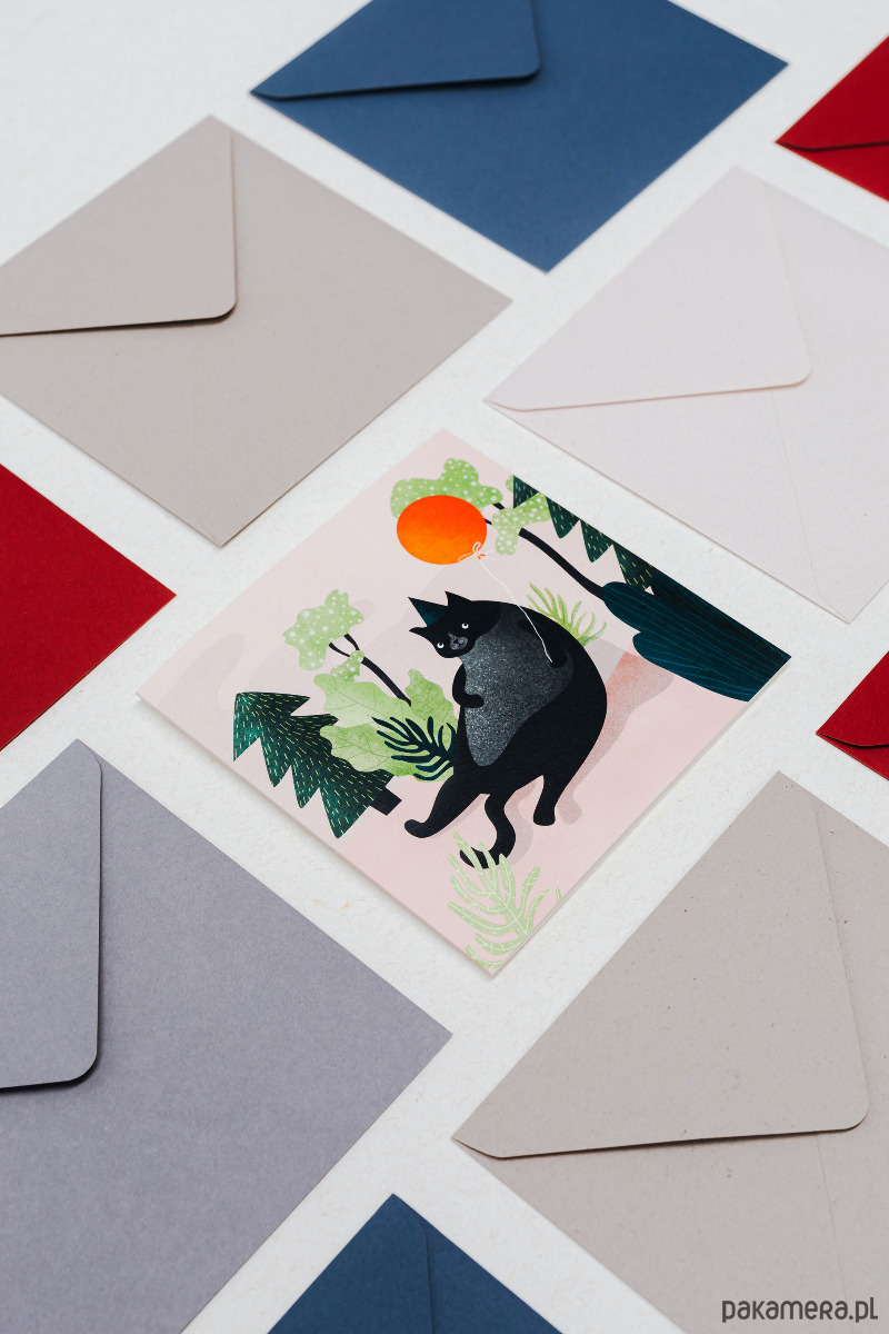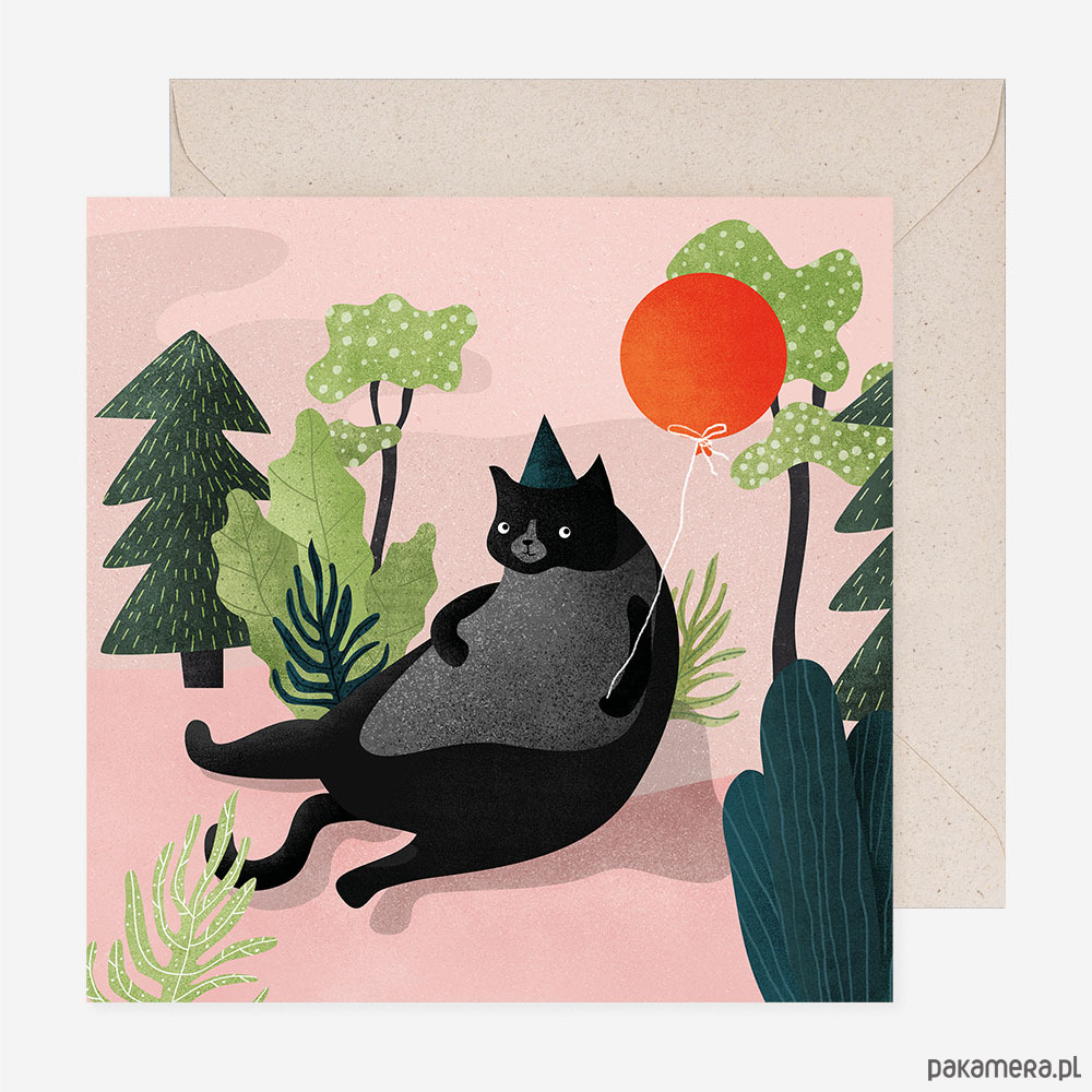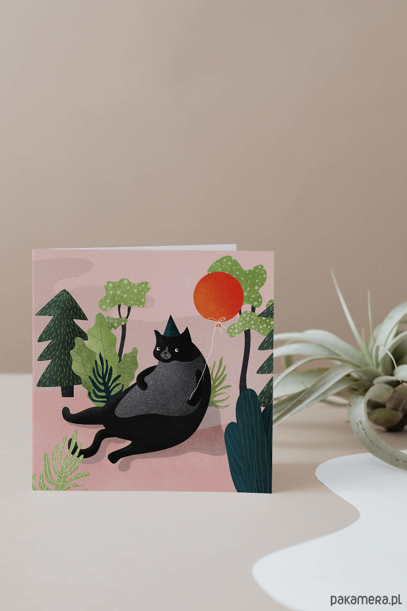 Kwadratowa składana kartka urodzinowa, doskonała dla małych i dużych miłośników kotów.
