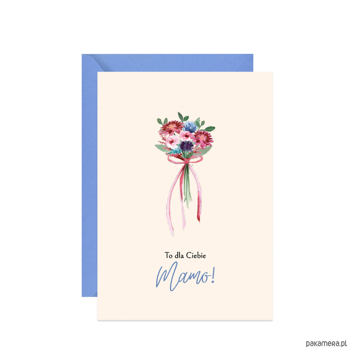 To kartka pełna czułości i miłości do mamy, doskonała na życzenia prosto z serca z okazji Dnia Matki, urodzin, imienin mamy, czy innego ważnego jej święta. Reprodukcja ręcznie malowanej akwareli - bukietu kwiatów z napisem To dla Ciebie Mamo! Pamiętaj, żeby przypominać mamie o tym, jaka jest dla Ciebie ważna.