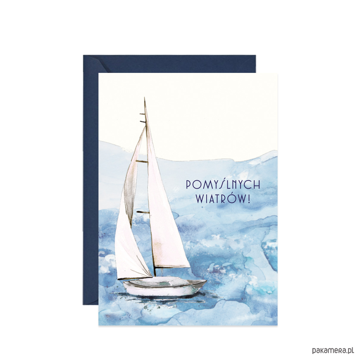 Kartka z motywem żaglówki z napisem Pomyślnych wiatrów doskonale sprawdzi się w roli karty na najserdeczniejsze życzenia z różnych okazji - ślubu, urodzin, rocznicy czy innego ważnego wydarzenia.