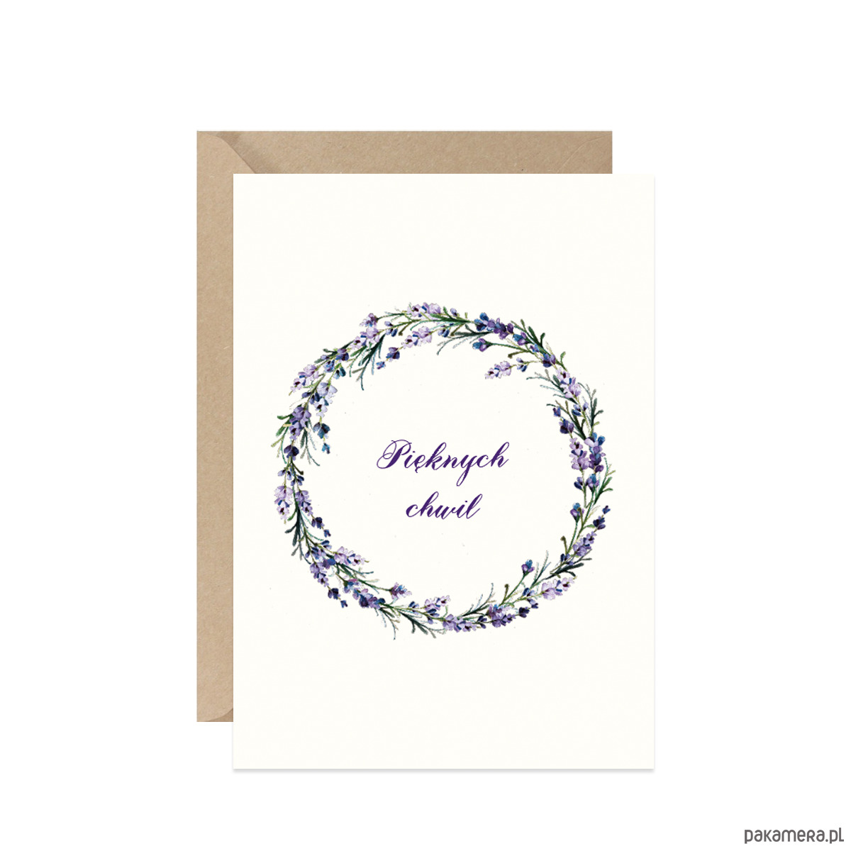 Kartka z motywem lawendy z napisem Pięknych chwil doskonale sprawdzi się w roli karty na najserdeczniejsze życzenia z różnych okazji - ślubu, urodzin, rocznicy czy innego ważnego wydarzenia.