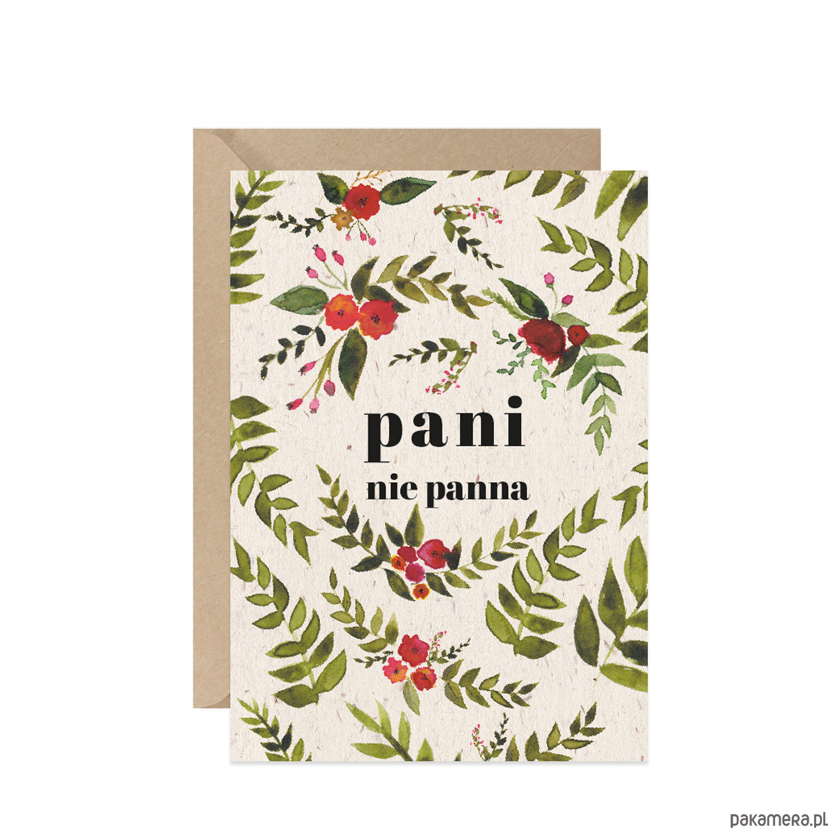 Otwierana kartka z życzeniami dla przyszłej żony na wieczór panieński z napisem "Pani nie panna" z akwarelową, kwiatowo-roślinną ilustracją. Oryginał malowany ręcznie, następnie ilustracja reprodukowana cyfrowo.
