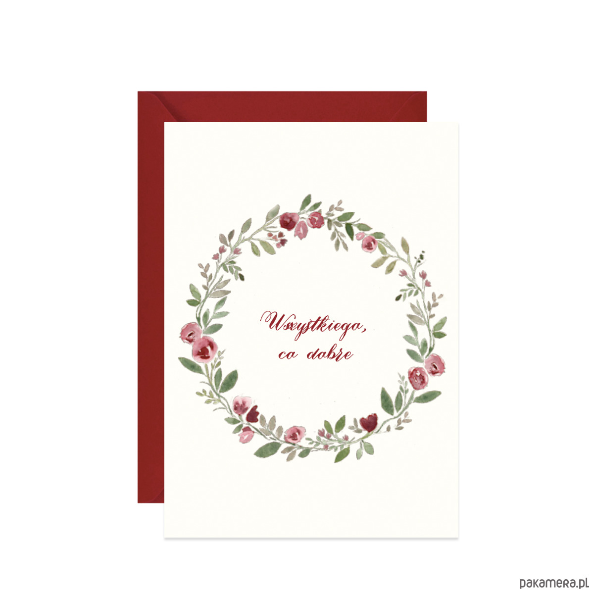 Kartka z motywem róż z napisem Wszystkiego, co dobre doskonale sprawdzi się w roli karty na najserdeczniejsze życzenia z różnych okazji - ślubu, urodzin, rocznicy czy innego ważnego wydarzenia.