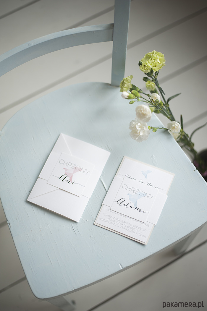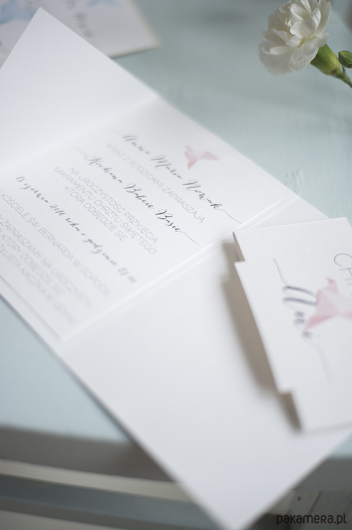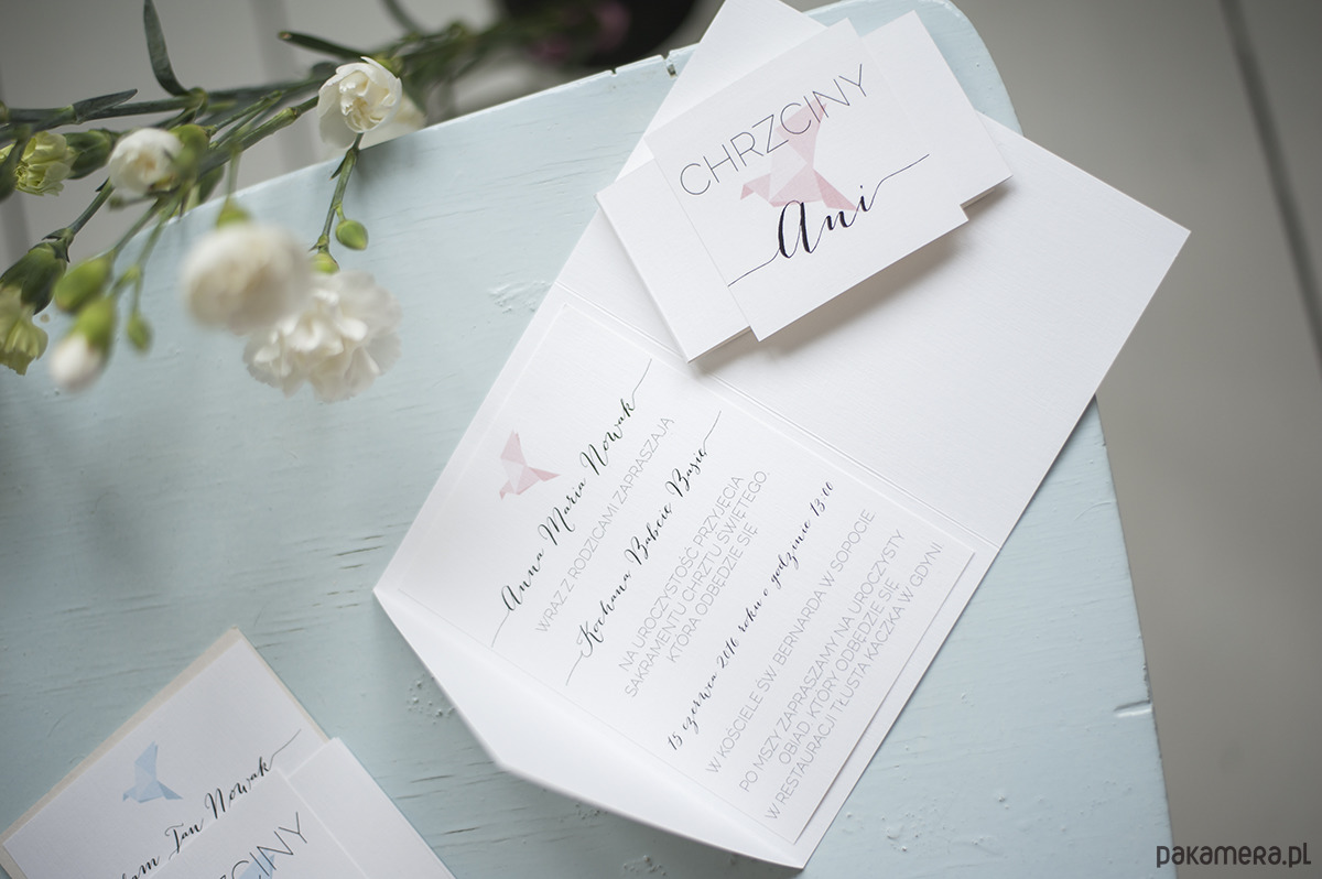 Zestaw zaproszeń na chrzciny, seria ORIGAMI, wersja różowa.