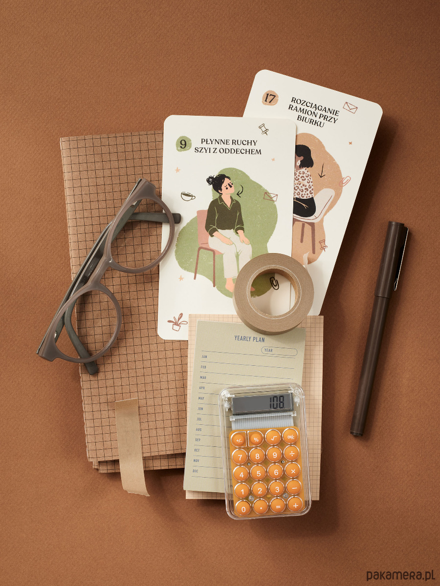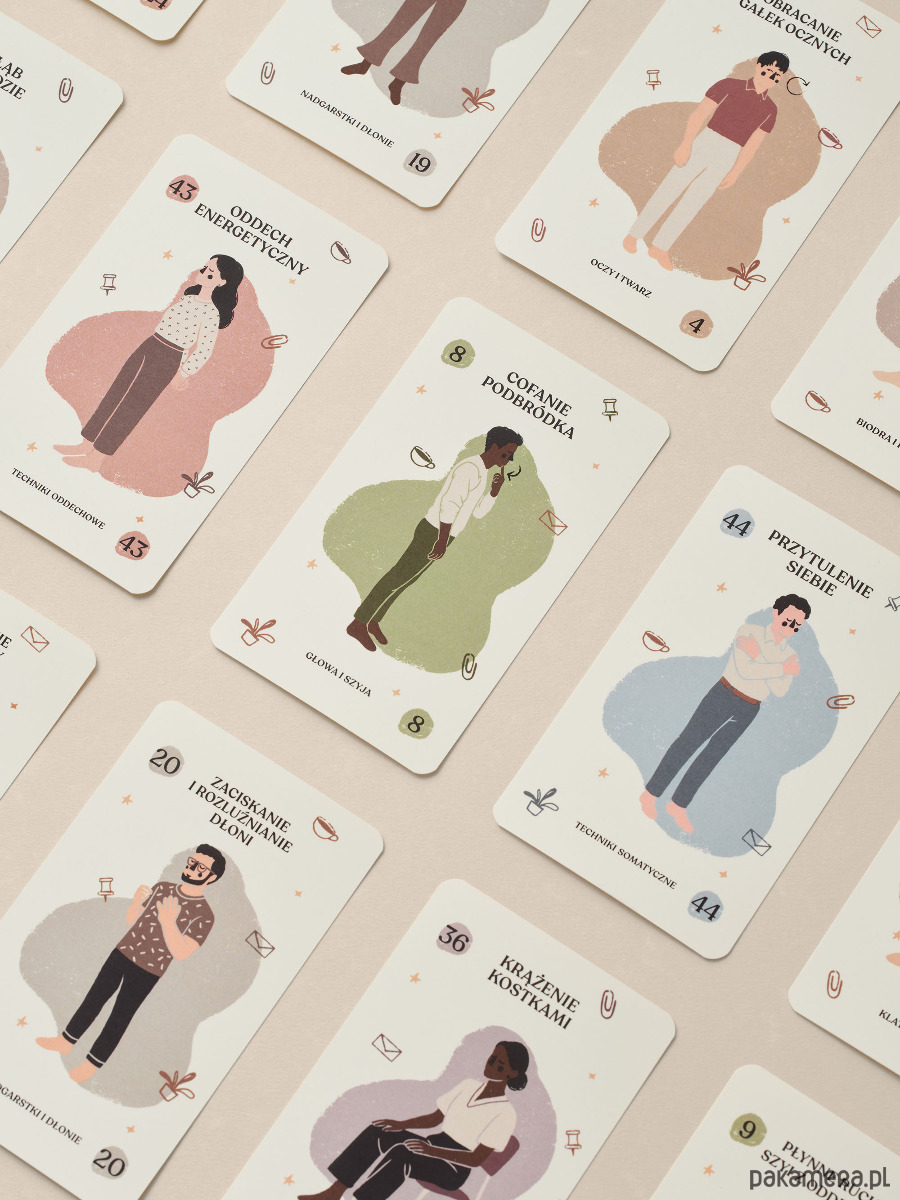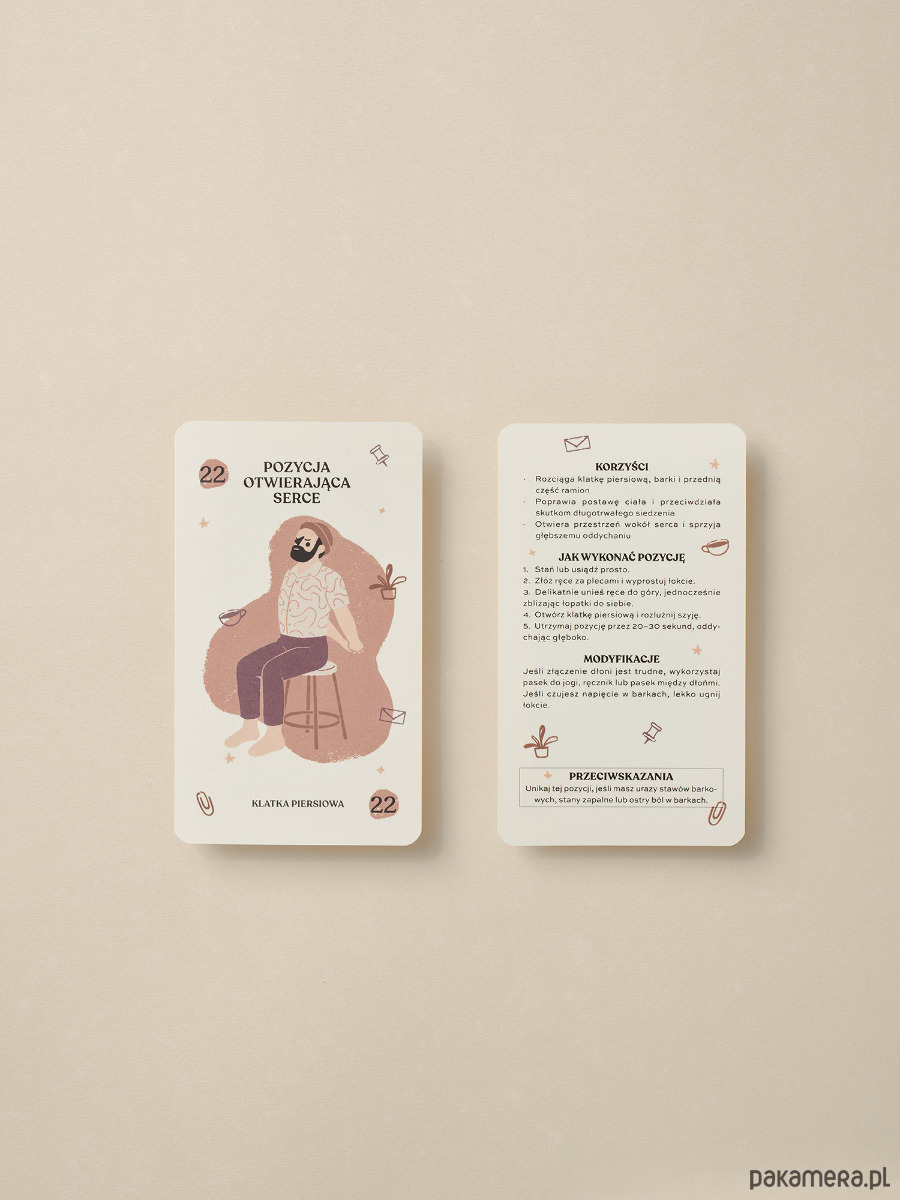 Zestaw kart z prostymi pozycjami jogi, technikami oddechowymi i somatycznymi dla wszystkich, którzy pracują przy biurku.