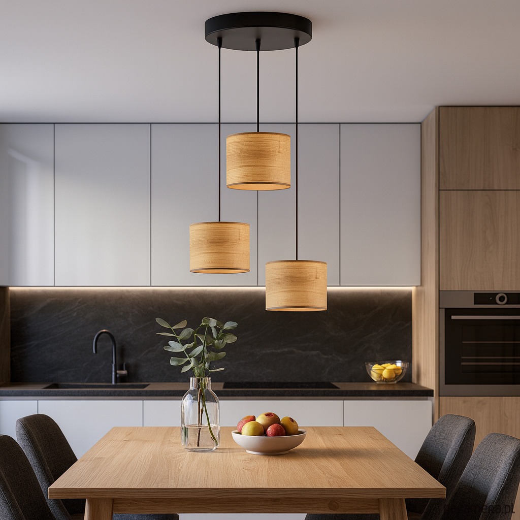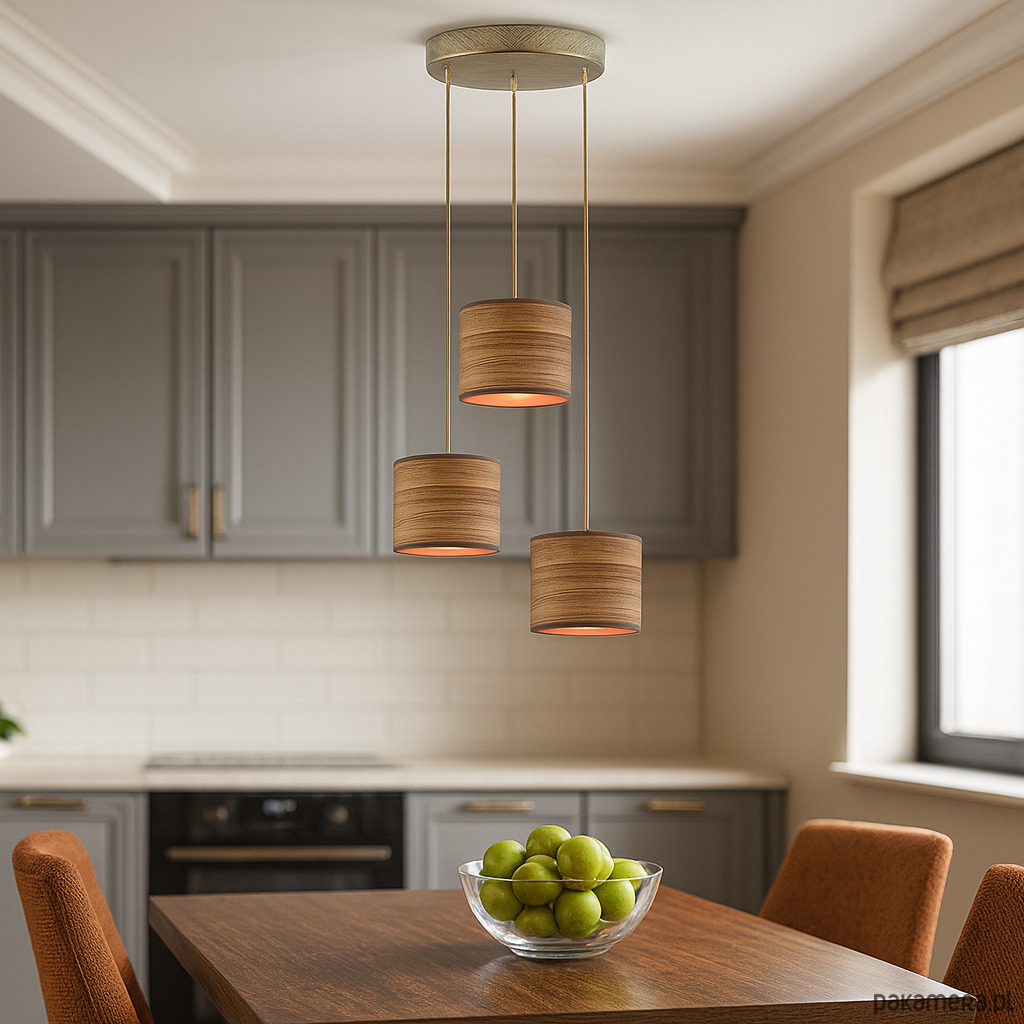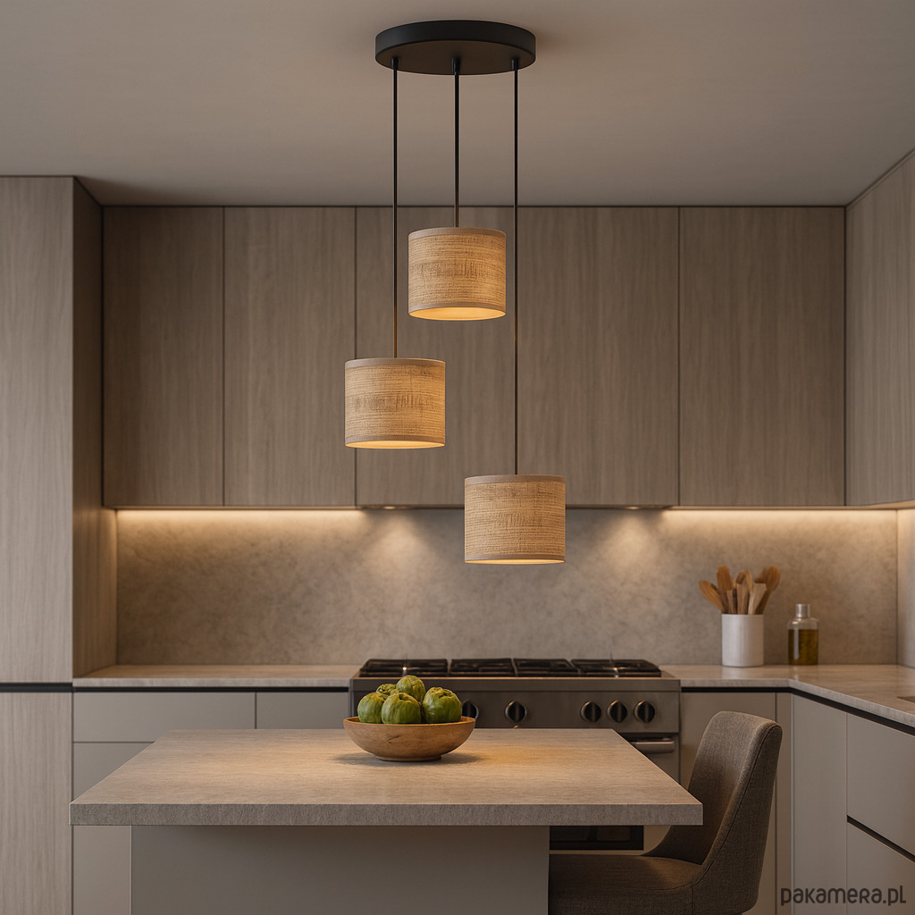 Kaskadowa lampa wisząca 3-punktowa PUEBLO ECO to propozycja dla osób, które poszukują eleganckiego i funkcjonalnego oświetlenia do domu. Trzy cylindryczne abażury zamocowane na okragłej konstrukcji czynią z tej oprawy uniwersalne źródło światła pasujące zarówno do kuchni, jadalni jak i do przestronnego salonu. Lampa wisząca do kuchni i jadalni 3-punktowa PUEBLO ECO doskonale prezentuje się nad stołem, wyspą kuchenną czy w centralnym punkcie salonu, równomiernie oświetlając przestrzeń i nadając jej przytulnego charakteru. Ten model kuchennej lampy wiszącej wyposażony jest w trzy oprawki na duży gwint E27, każda o mocy 60W, co w sumie daje aż 180W światła.
