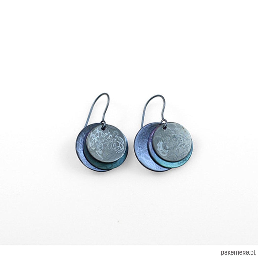 Kolczyki w kształcie złożonych trzech krążków w całości zrobiłem ręcznie z tytanu.Są lekkie, efektowne i mienią się kolorami.Są wielkości 2,0 cm .W całości kolczyki są długości ok.3,5 cm. Zawieszka z tytanu .Na odwrocie sygnowane wygrawerowanym podpisem.Tytan jest niezwykle lekkim i trwałym metalem który nie wywołuje żadnych alergii-jest hipoalergiczny-stosowany w