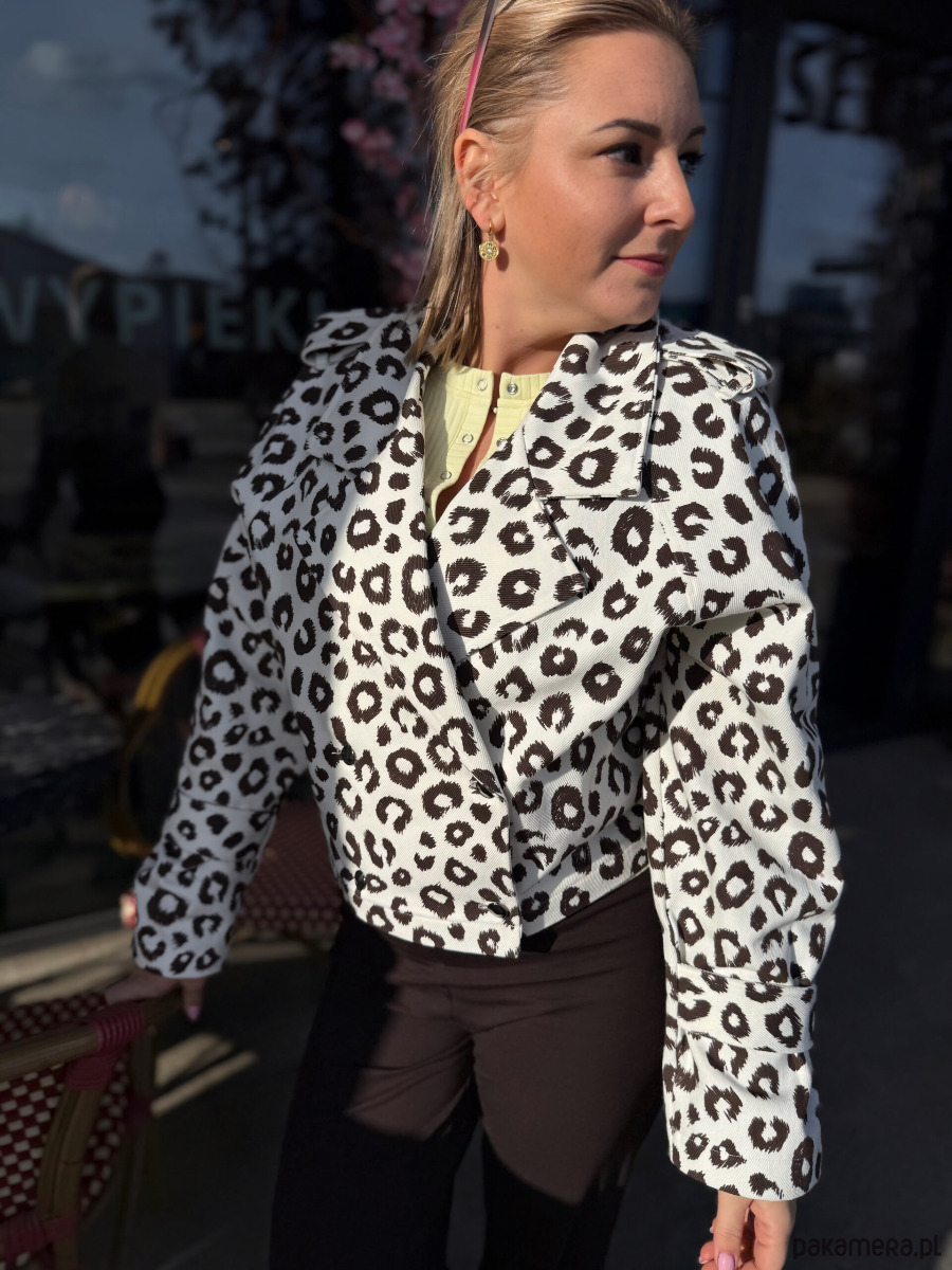 Kurtka została uszyta z wyrazistej tkaniny jeansowej o grubym, mięsistym chwycie. To w 100% bawełniany denim w odcieniu łamanej bieli, ozdobiony brązowym nadrukiem w cętki. Materiał jest stabilny, mocny i trwały — charakterystyczny dla klasycznego denimu o splocie skośnym. Dzięki temu kurtka dobrze trzyma formę i będzie świetnie wyglądać przez długi czas.
