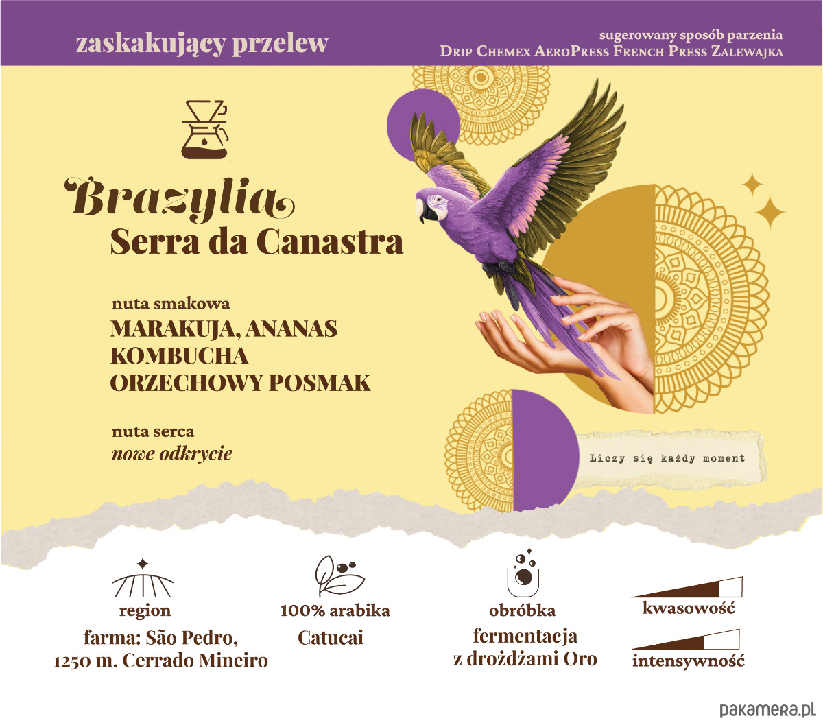 W Focusach kawa Brazylia ORO została wypalona jaśniej, z myślą o metodach przelewowych, aby podkreślić jej strukturę i charakter fermentacji. To propozycja dla osób, które szukają klasycznej bazy z nowoczesnym, owocowym twistem.