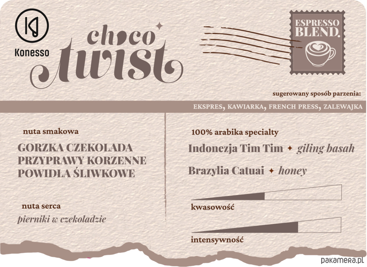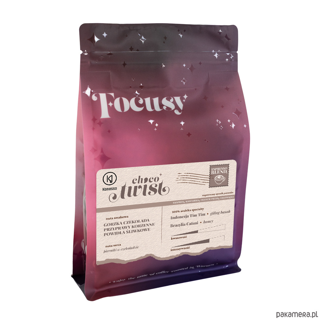 Palarnia kawy Focusy poleca espresso z Twistem: Blend Arabik stworzony specjalnie dla Konesso. Czekoladowa Brazylia połączona z korzenno-śliwkową Indonezją tworzą duet idealny dla każdego, kto lubi niestandardowe espresso czy kawę z mlekiem z Twistem. Oba ziarna pochodzą z kobiecych Farm. W smaku odkryjesz dużo czekolady, nuty korzennych przyporaw i kwasowość fioletowej śliwki. Wypalona średnio, idealnie sprawdzi się do parzenia w ekspresie ciśnieniowym lub w kawiarce. Idealna propozycja na jesień czy zimę jako pumpkin spice latte lub korzenny flat white.