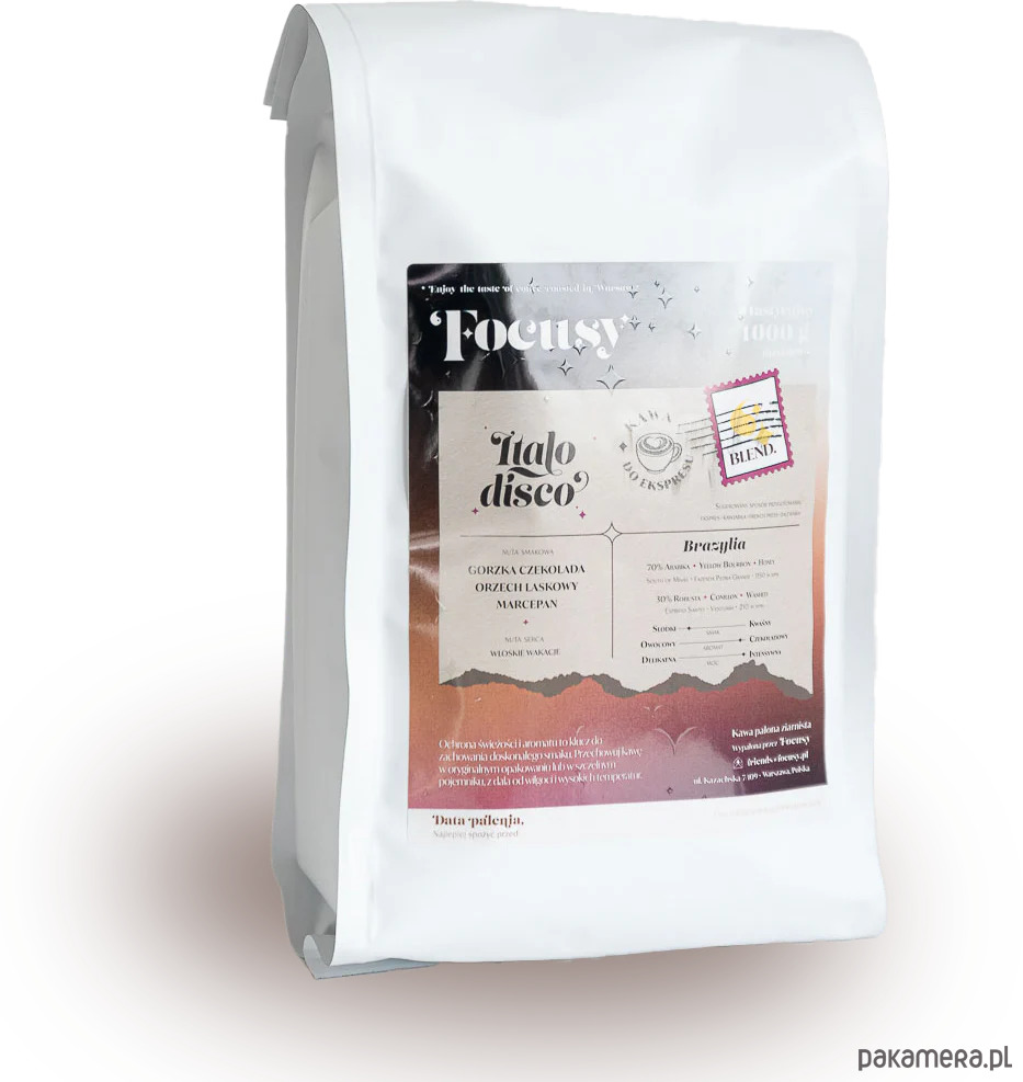 Palarnia kawy Focusy poleca gęste i mocne espresso: ItaloDisco to blend ziaren kawy z gatunku Arabika i Robusta, pochodzące z Brazylii. Ziarno jakości speciality, czyli ocenione na co najmniej 80 punktów w skali do 100. Wypalona w mocniejszym stopniu w stylu włoskim by podkreślić słodycz, smak gorzkiej czekolady i wydobyć intensywne nuty migdałów. Idealnie sprawdzi się do parzenia w każdym ekspresie, zarówno domowym typu Jura, Saeco czy Nivona, jak i kolbowym ciśnieniowym i kawiarce. Kawę charakteryzuje całkowity brak kwasowości. Focusy to palarnia kawy stworzona i w całości prowadzona przez Sylwię Rachfalską, finalistkę Mistrzostw Polski Roasting (zawody w paleniu kawy pod patronatem Specialty Coffee Association). Odkryj jej wyjątkową selekcję ziaren i poczuj różnicę.