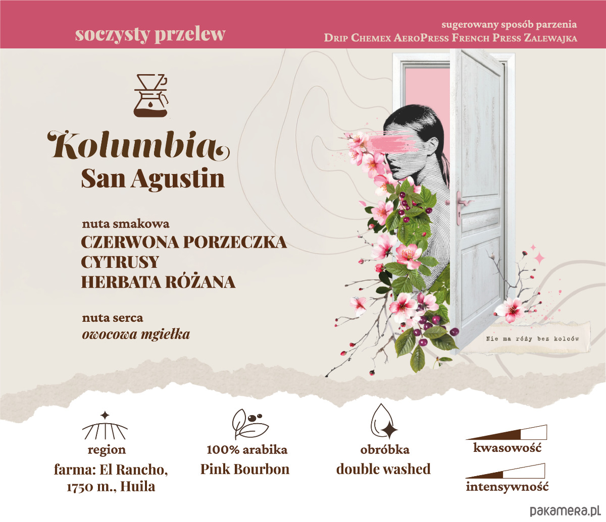 Pink Bourbon to jedna z najbardziej wyjątkowych odmian uprawianych w Kolumbii. Daje bardzo czysty, elegancki profil, w którym często pojawiają się nuty czerwonych owoców, cytrusów i kwiatów. To kawa, która łączy intensywność z lekkością — jest wyraźna, ale nie przytłacza. Właśnie dlatego tak dobrze sprawdza się w przelewach, gdzie można w pełni poczuć jej świeżość, wysoką kwasowość i złożoność.