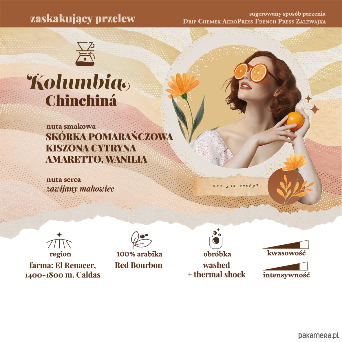 W filiżance pojawiają się nuty skórki pomarańczy, amaretto i cytrusowej, lekko fermentowanej kwasowości przypominającej kiszoną cytrynę, przełamane słodkim, deserowym skojarzeniem makowca. Profil jest złożony, intensywny i wielowymiarowy.