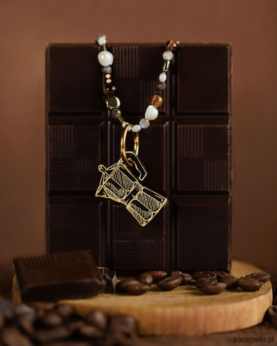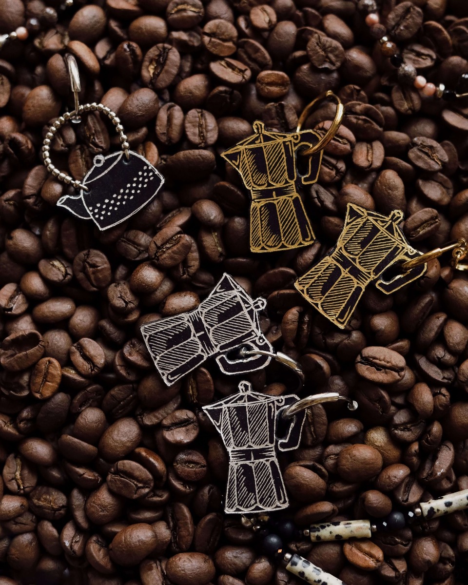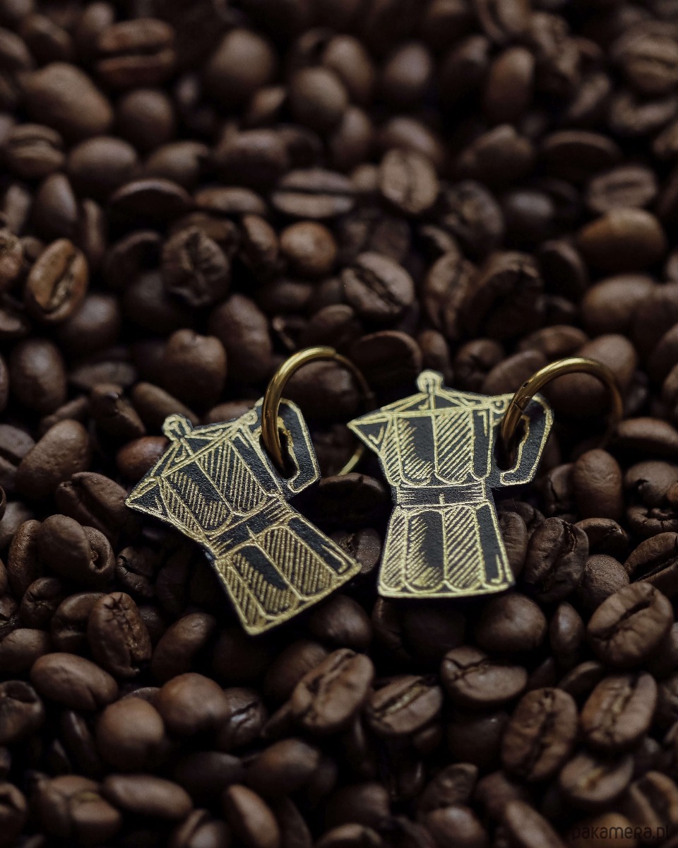 Zawieszka w kształcie kawiarki wykonana ze skóry naturalnej, zdobiona ręcznie wykonaną metaliczną ilustracją.