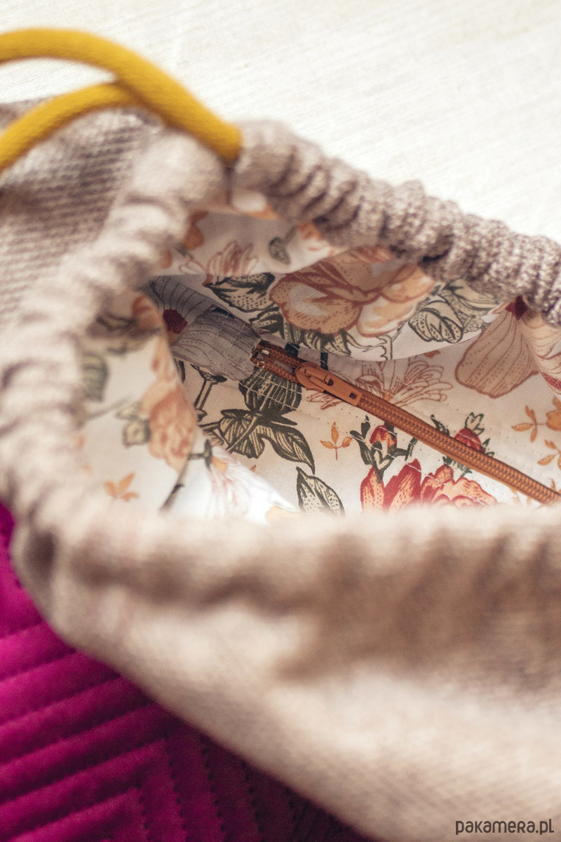 Torba worek ściągana grubym sznurem bawełnianym w rozmiarze XL. Z przodu dwie kieszenie, w środku kieszonka zapinana na suwak. Sznurek w kolorze curry.