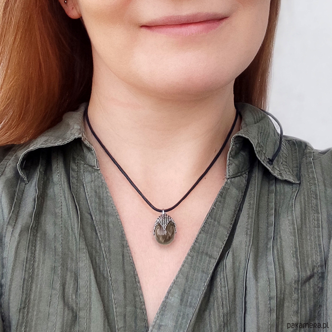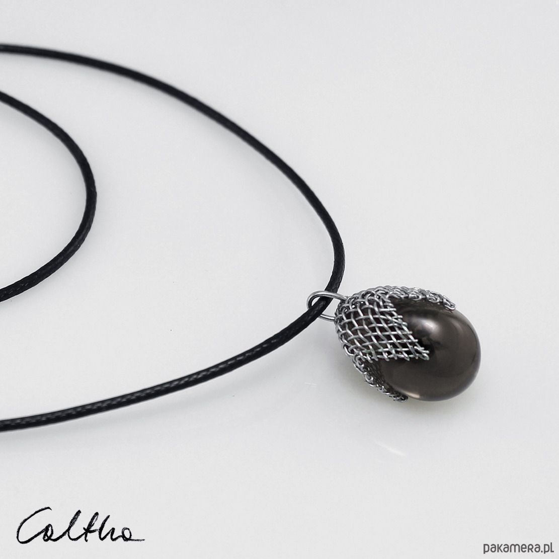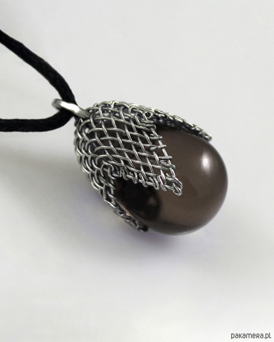 Szklana kropla oprawiona w ręcznie formowaną metalową siateczkę. Całkowita wielkość wisiorka to ok. 2,5 cm. W komplecie bawełniany sznurek do zawieszenia.