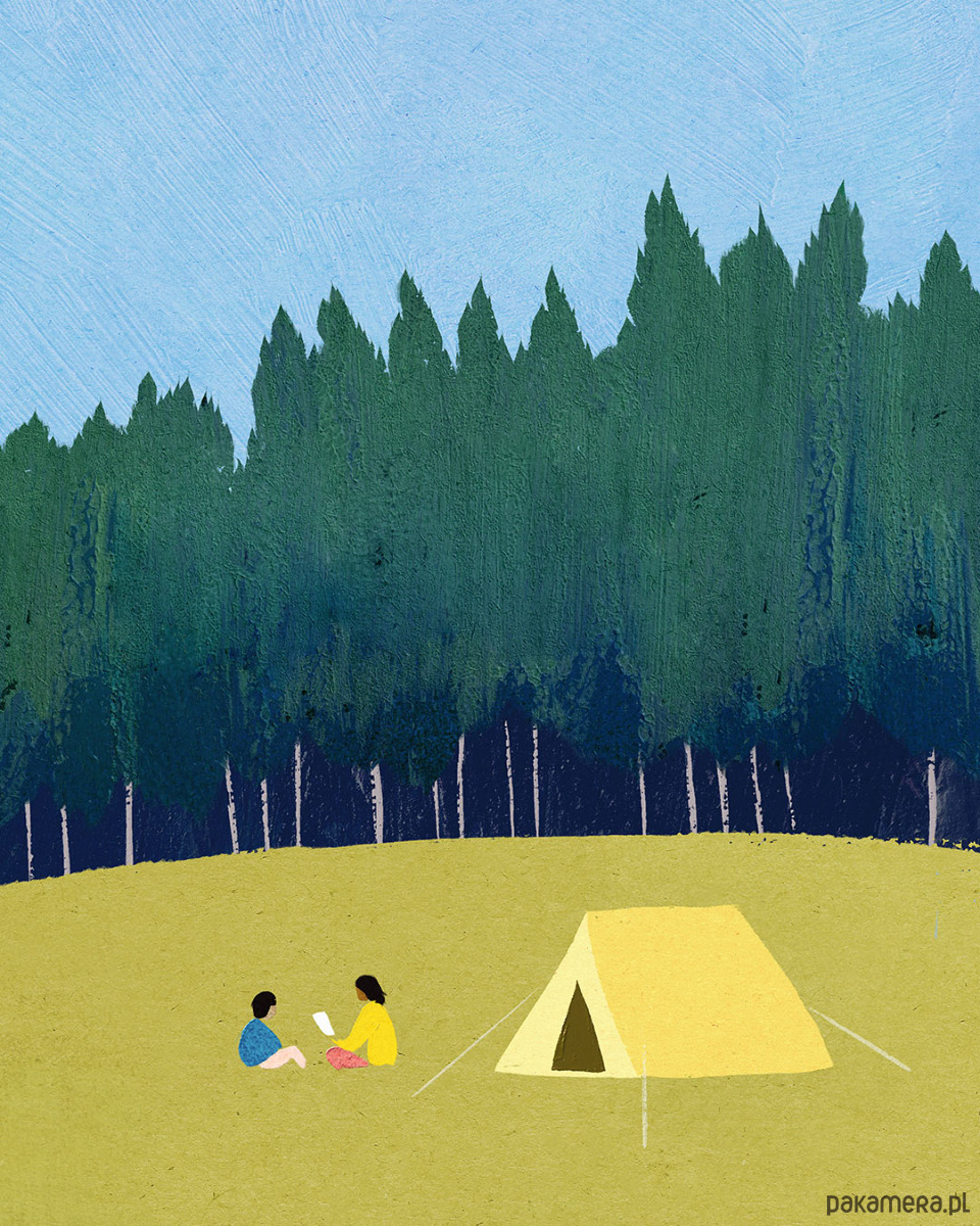 Najlepsze wspomnienia wakacji to często te, w których główną rolę gra bliska osoba, natura i słoneczne niebo. Takie właśnie najfajniejsze lato jest tematem plakatu "Kemping pod namiotem". Sielankowy widok nakreślony został uproszczoną, nowoczesną kreską.