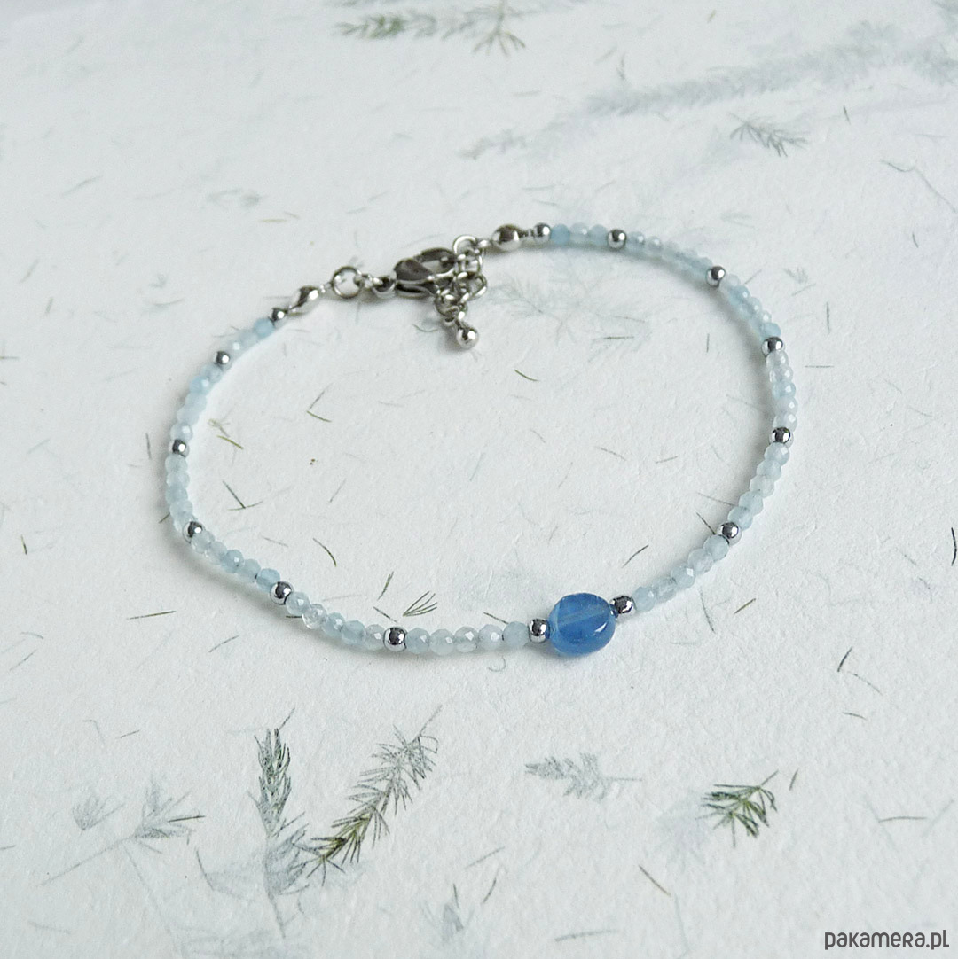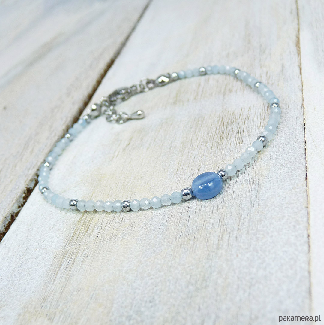 kianit 6 mm, akwamaryn fasetowane kulki 2 mm, hematyt srebrny, stal szlachetna srebrna