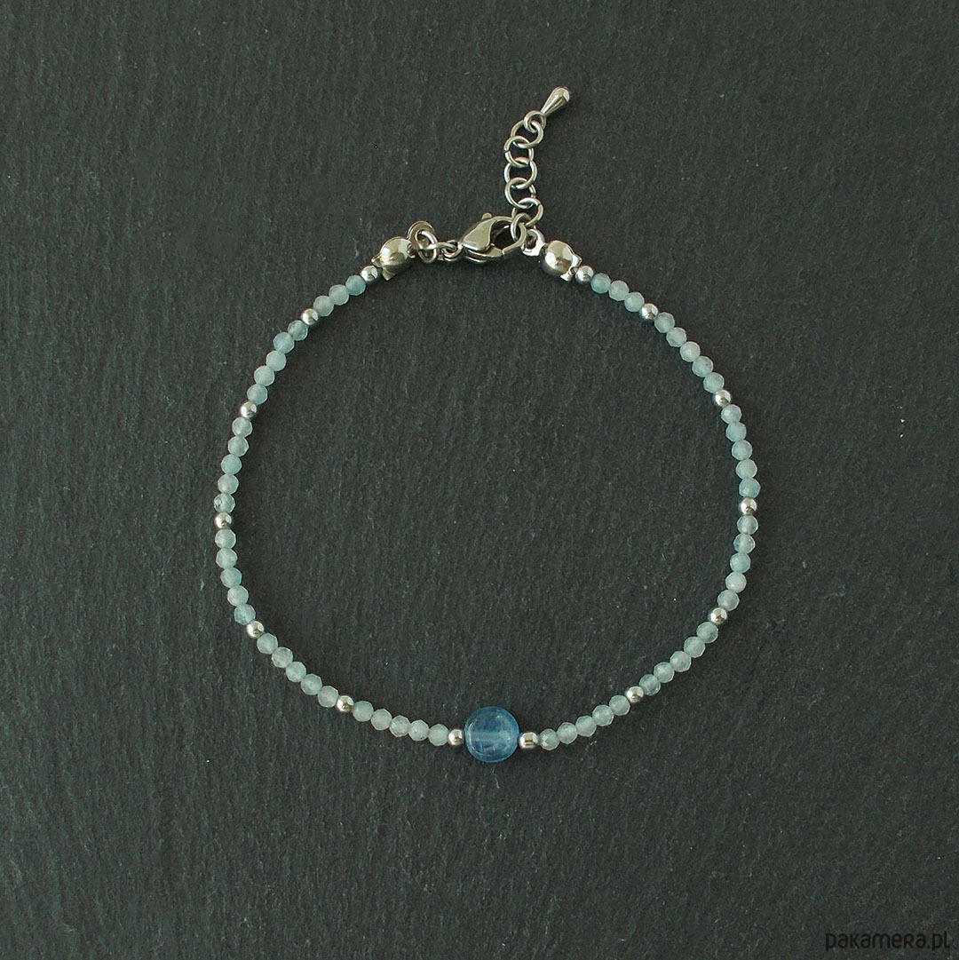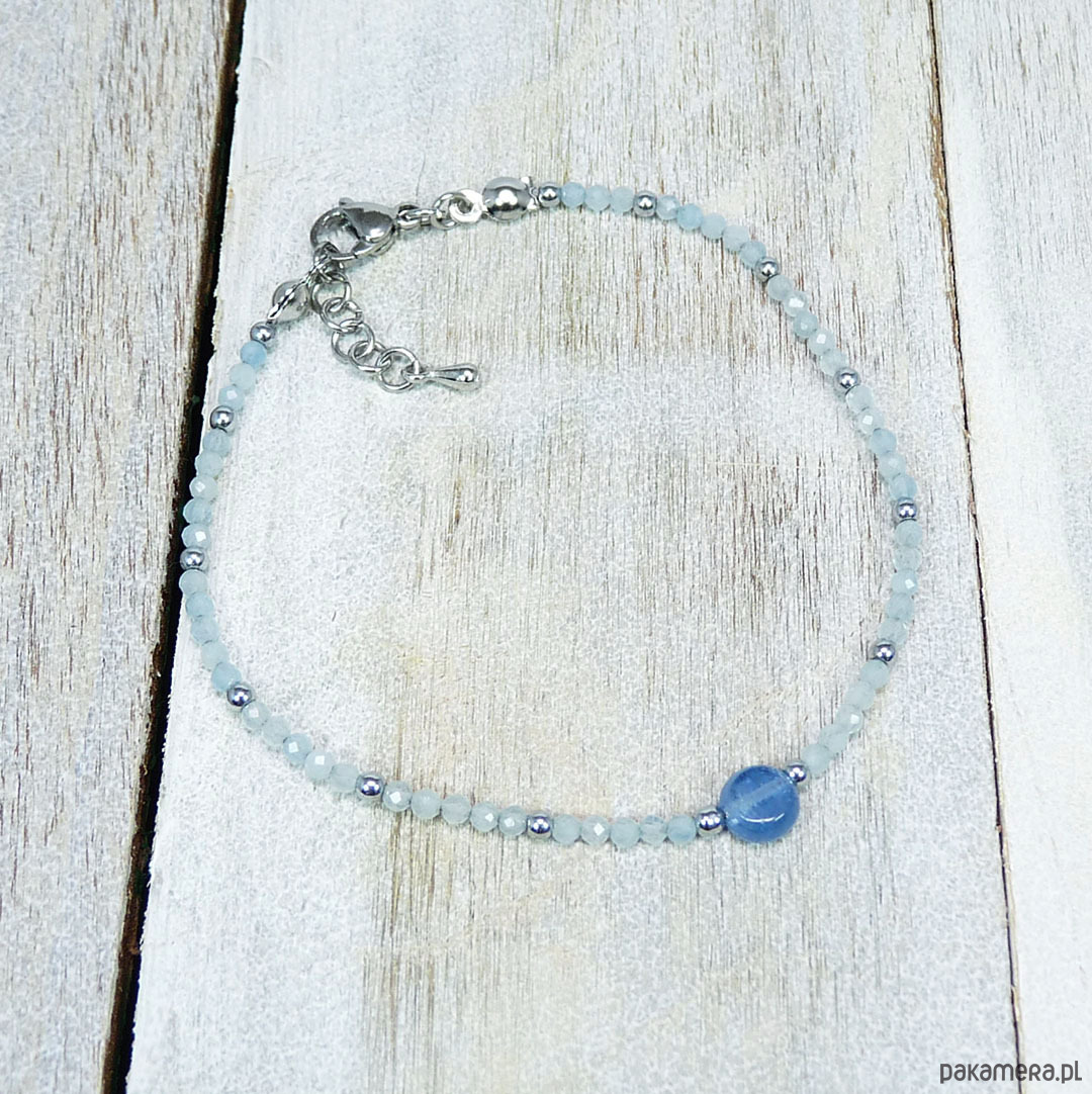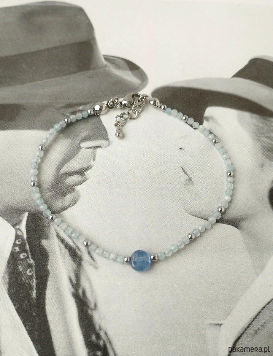 kianit 6 mm, akwamaryn fasetowane kulki 2 mm, hematyt srebrny, stal szlachetna srebrna