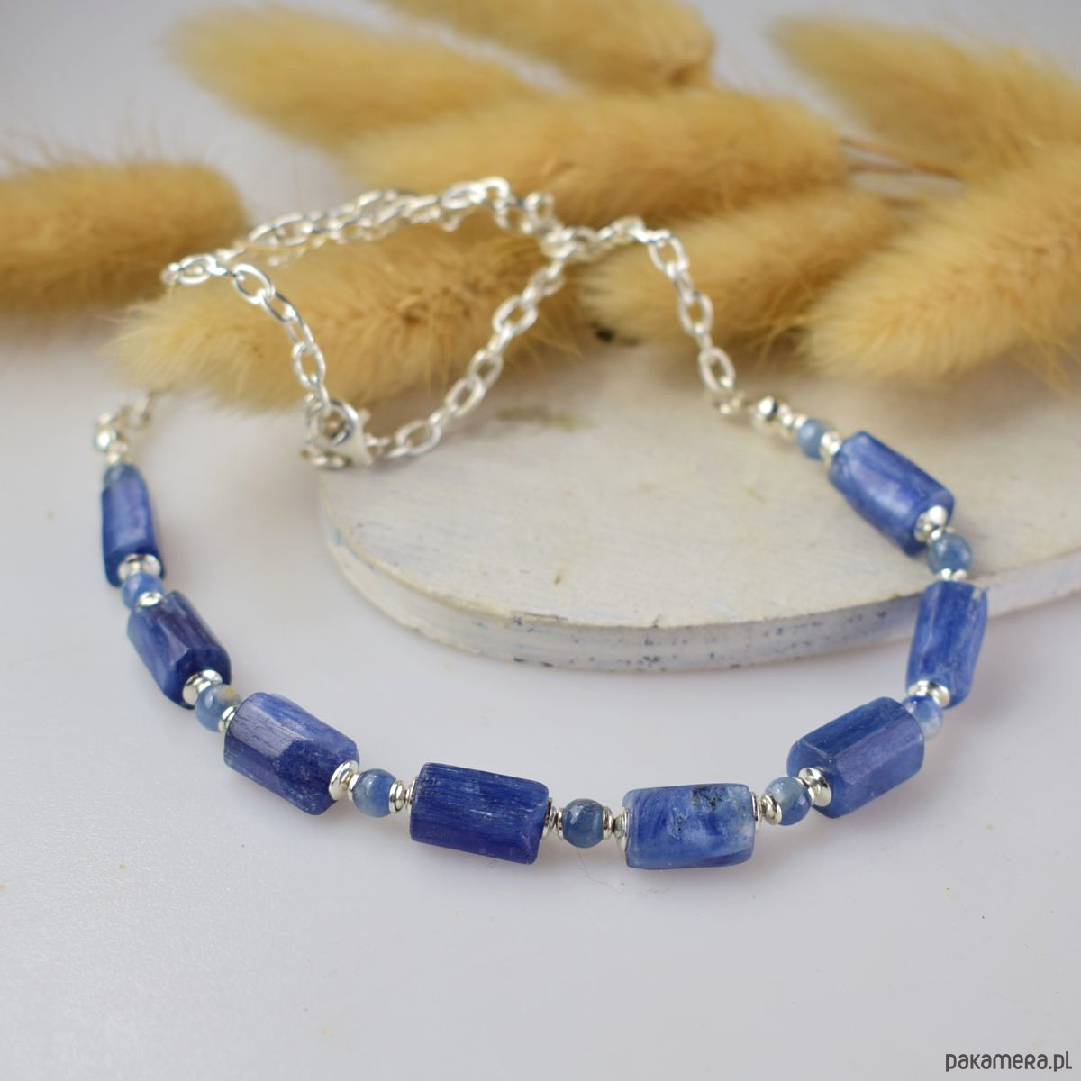 Naszyjnik wykonany w całości ze srebra (próba 925) z kianitem. Długość regulowana do maksymalnie  45 cm.. Biżuteria zostanie ozdobnie zapakowana.
