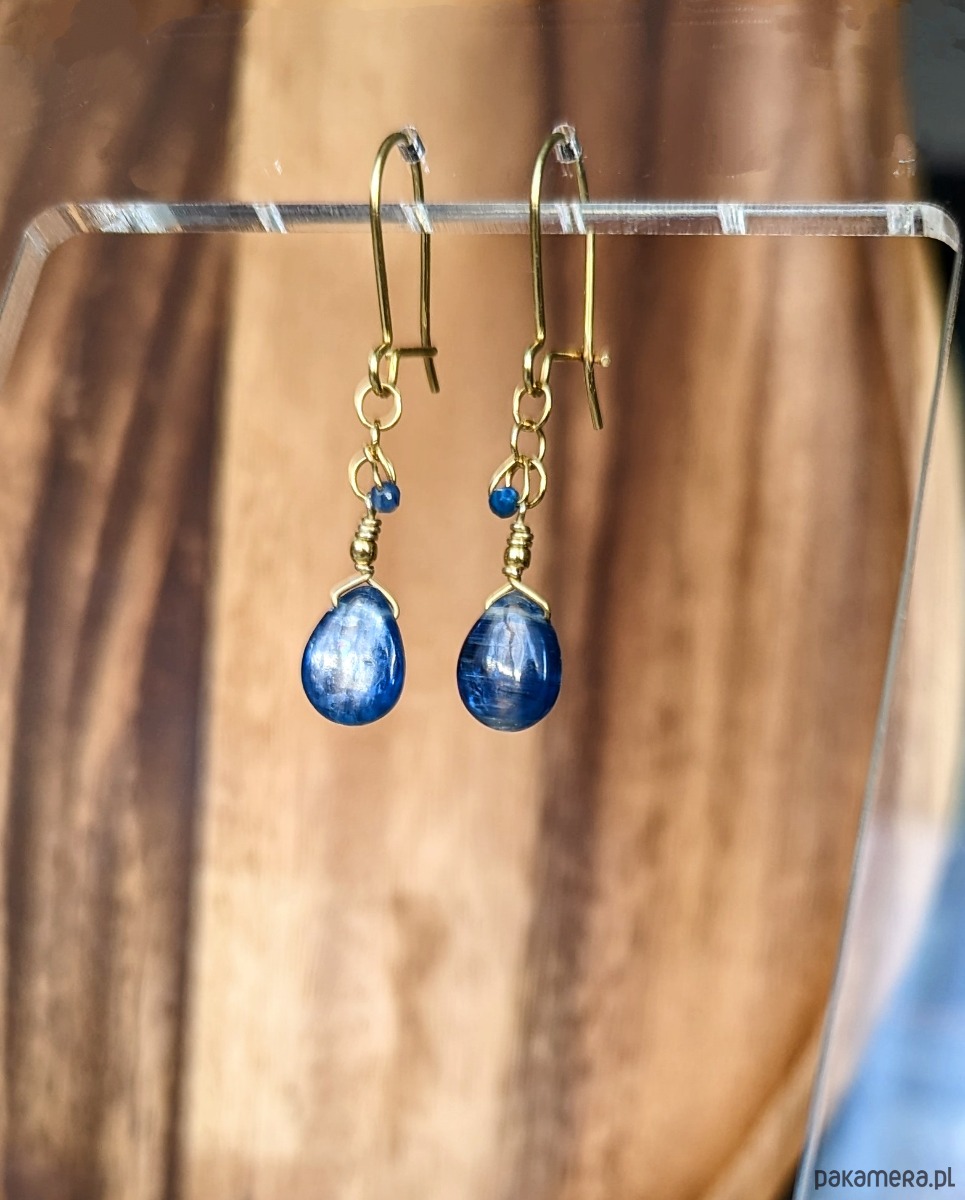 Kolczyki z pięknym, świetlistym kianitem. Zostały wykonane ze złoconego srebra i zawieszone na prostym zamykanym biglu. Dzięki kilku oczkom łańcuszka kamienie delikatnie kołyszą się.