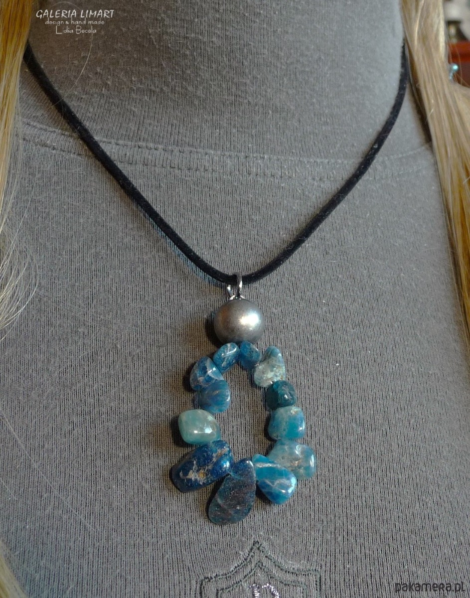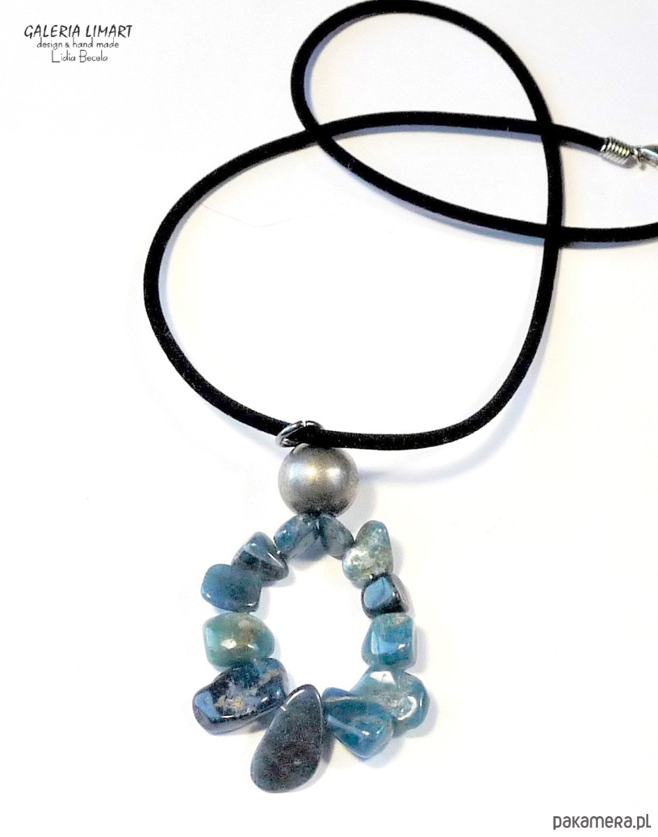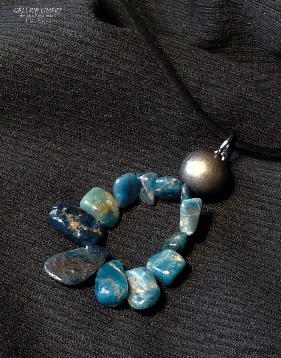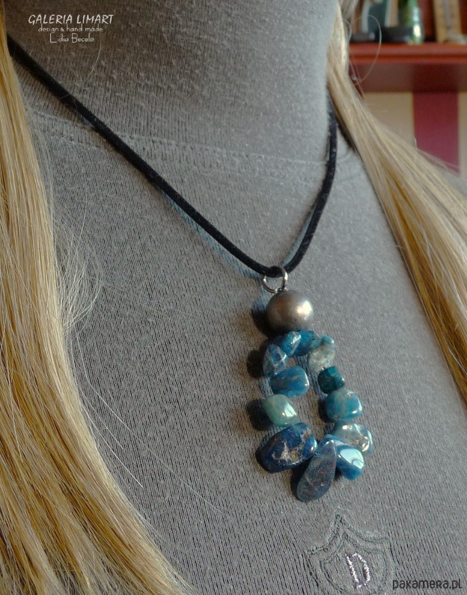 Autorski delikatny i subtelny wisiorek z pięknymi w swym ubarwieniu naturalnymi surowymi niewielkimi kyanitami (kianit, cyjanit, dość rzadki kamień). To niezwykły minerał, potrafi się mienić różnymi odcieniami niebieskiego czasami wpadającego w zieleń, a czasami w granat. Dodatkowo ozdobiony dużą stalową kulą, która nadaje mu charakteru.