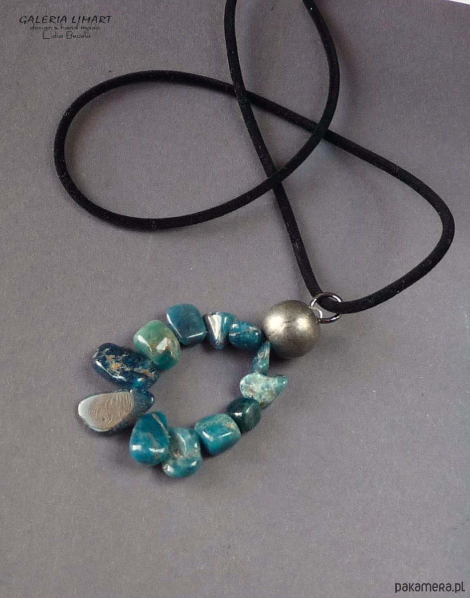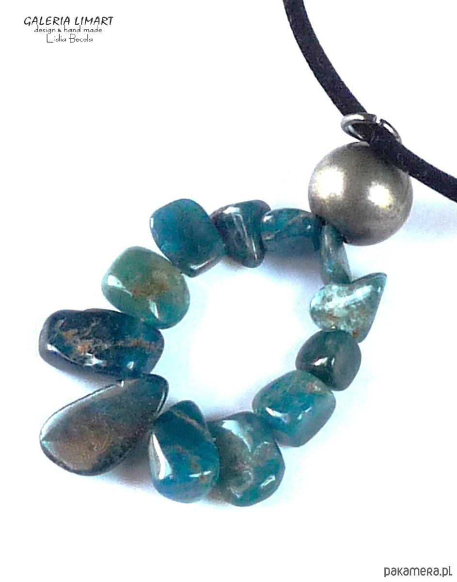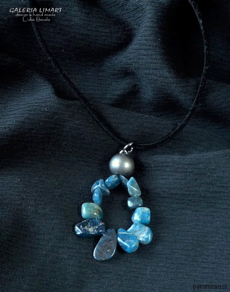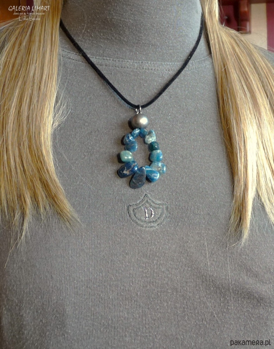 Autorski delikatny i subtelny wisiorek z pięknymi w swym ubarwieniu naturalnymi surowymi niewielkimi kyanitami (kianit, cyjanit, dość rzadki kamień). To niezwykły minerał, potrafi się mienić różnymi odcieniami niebieskiego czasami wpadającego w zieleń, a czasami w granat. Dodatkowo ozdobiony dużą stalową kulą, która nadaje mu charakteru.