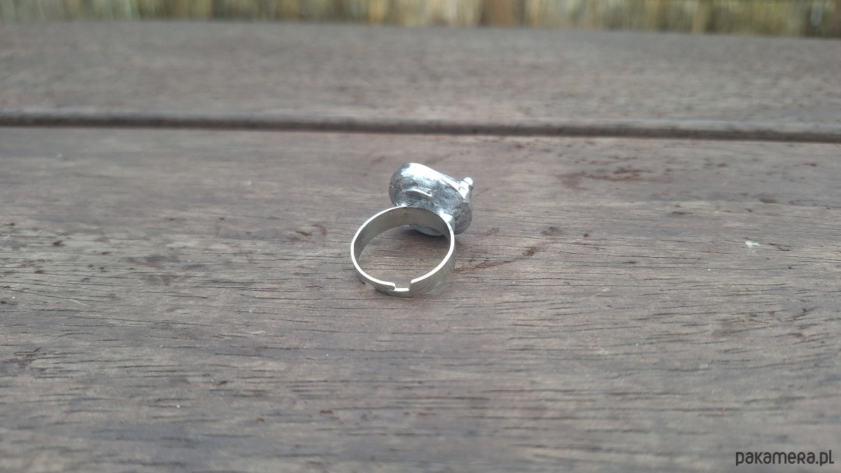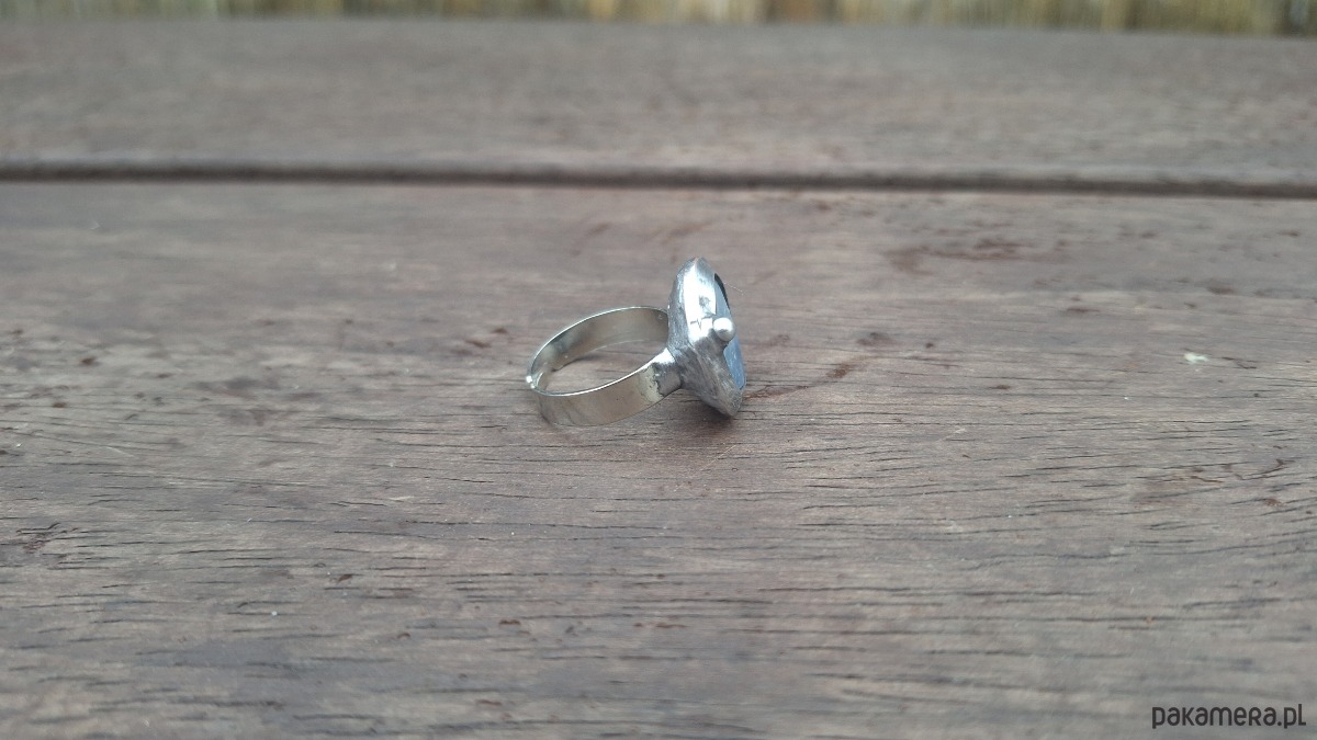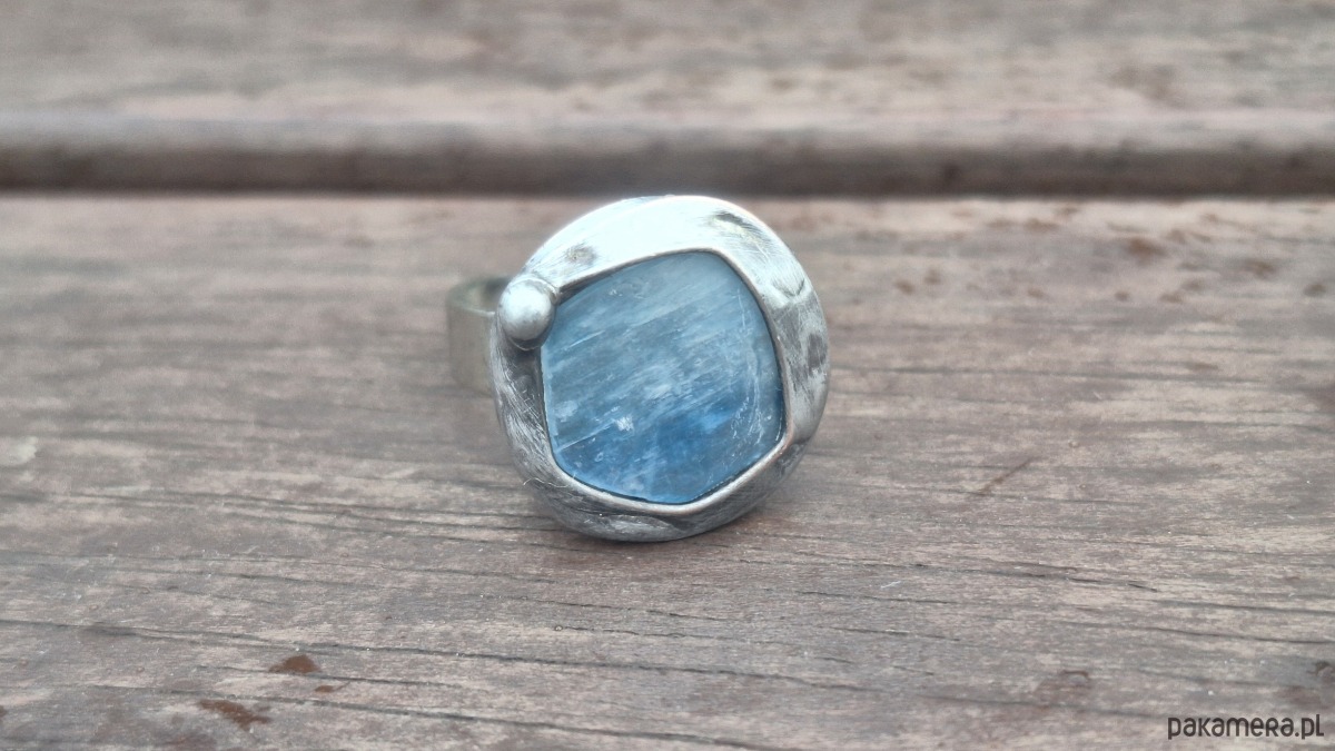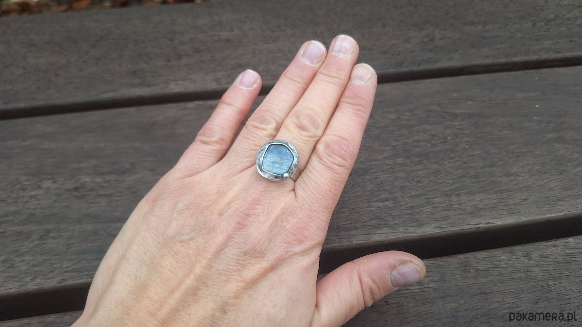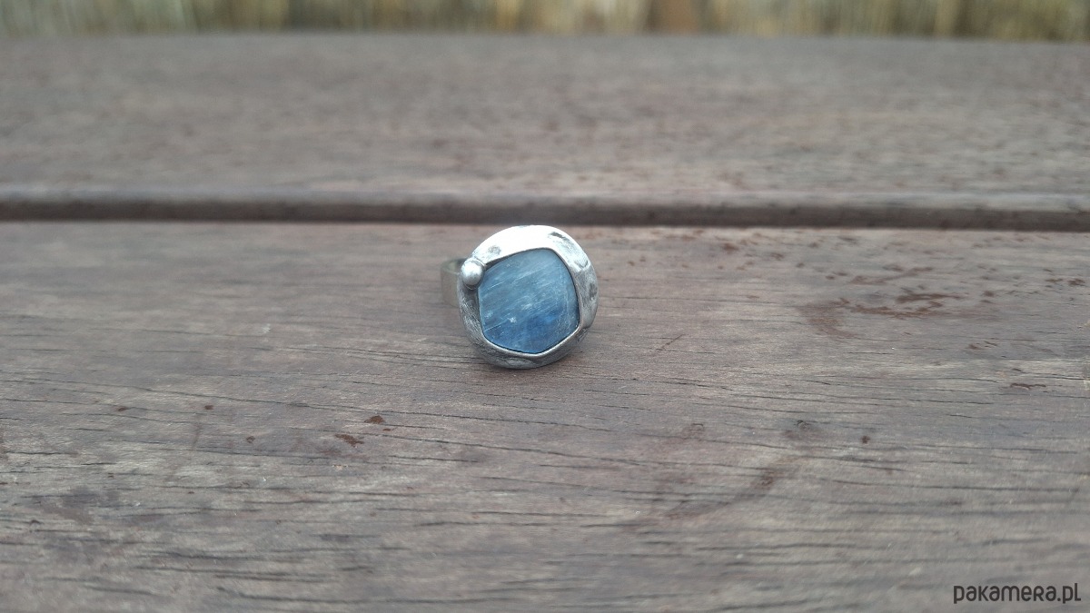 Pierścionek wykonany z miedzi, cyny i kianitu. Wymiary ok. 1.5 na 1.5 cm. Regulowany. Nie jest ciężki.