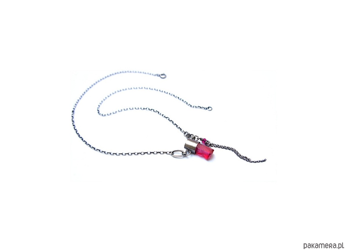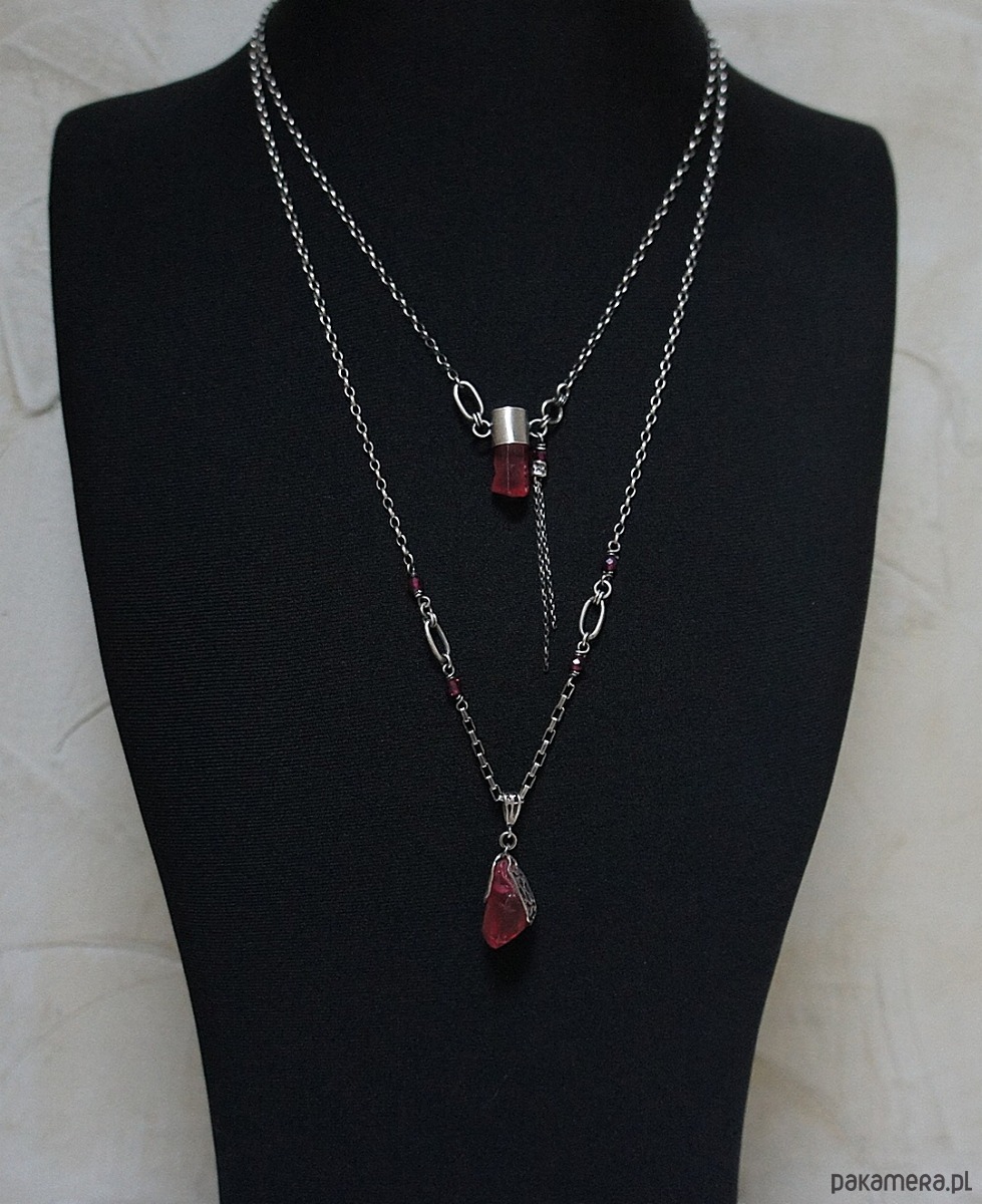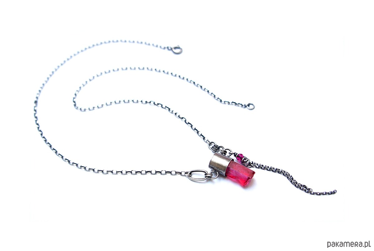 Naszyjnik wykonany własnoręcznie od podstaw ze srebra [pr. 925] w połączeniu z surową nieregularną bryłka kwarcu malinowego [20mm],fasetowaną kuleczka rubinu [4mm -syntetyczny] . Całość oksydowana i przetarta. Całkowita długość naszyjnika 46,5 cm. Biżuteria ozdobnie zapakowana. Naszyjnik skomponowany tak, by mógł stanowić komplet z drugim naszyjnikiem widocznym na zdjęciach.