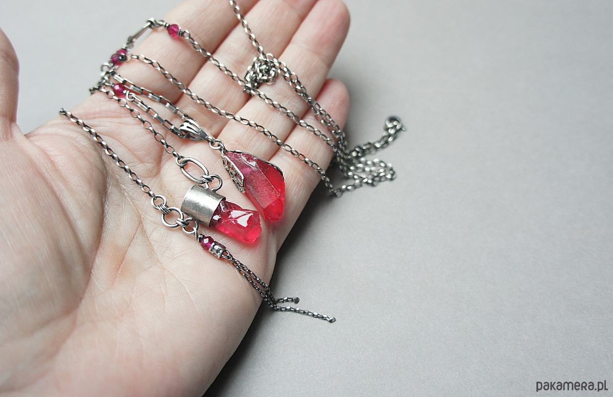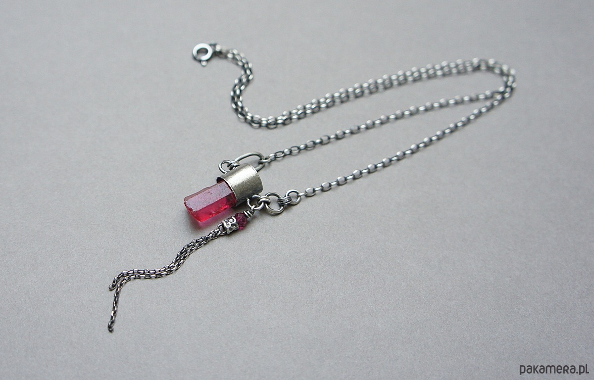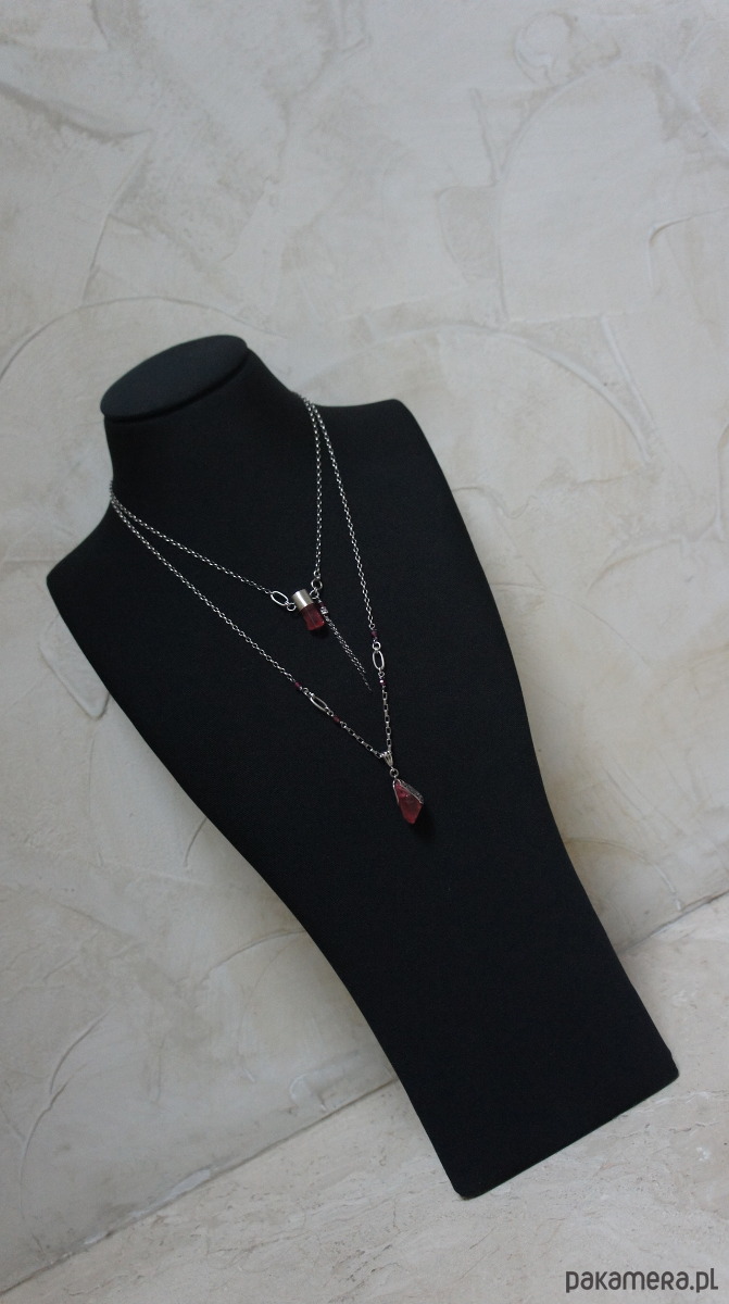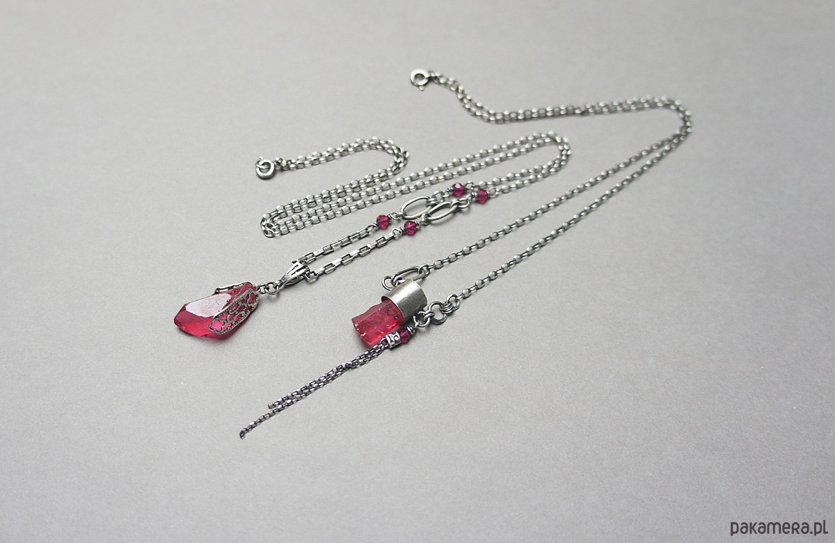Naszyjnik wykonany własnoręcznie od podstaw ze srebra [pr. 925] w połączeniu z surową nieregularną bryłka kwarcu malinowego [20mm],fasetowaną kuleczka rubinu [4mm -syntetyczny] . Całość oksydowana i przetarta. Całkowita długość naszyjnika 46,5 cm. Biżuteria ozdobnie zapakowana. Naszyjnik skomponowany tak, by mógł stanowić komplet z drugim naszyjnikiem widocznym na zdjęciach.