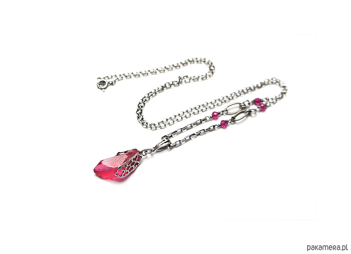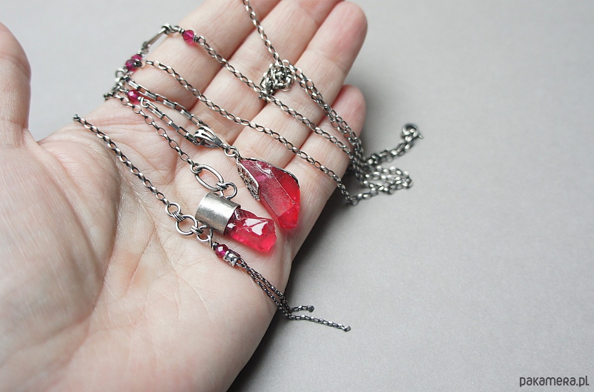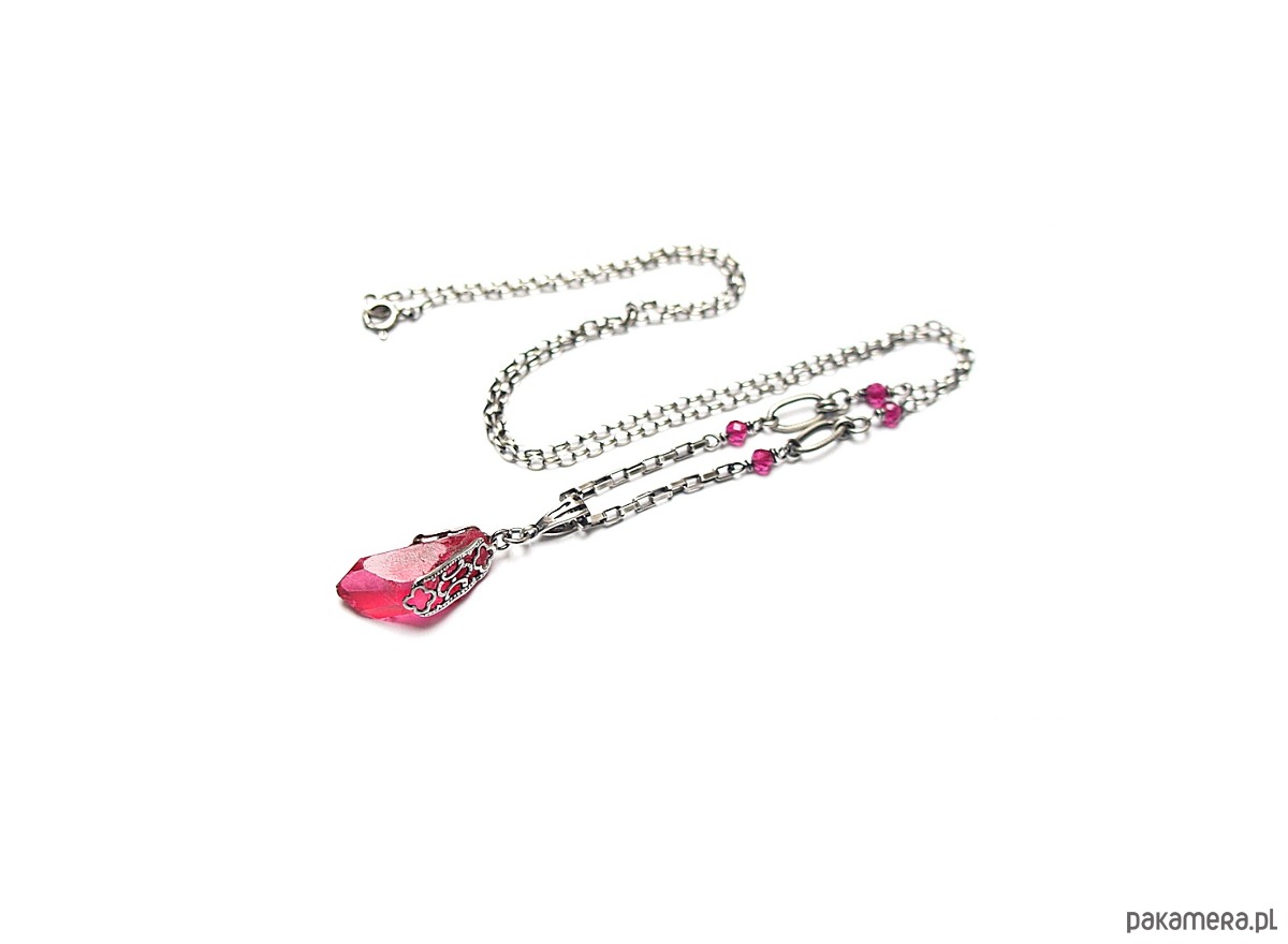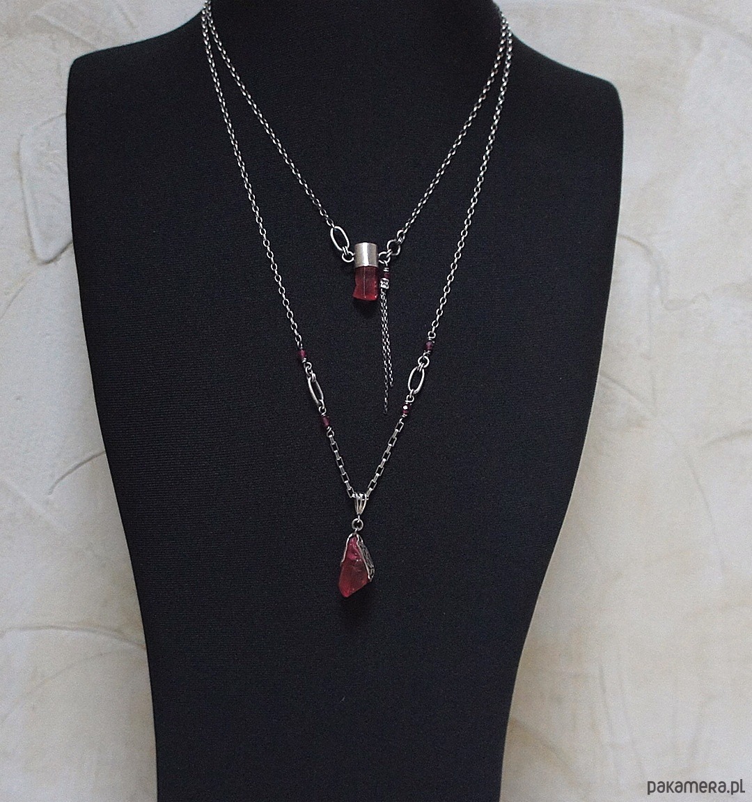 Naszyjnik wykonany własnoręcznie od podstaw ze srebra [pr. 925] w połączeniu z surową nieregularną bryłka kwarcu malinowego [24mm],fasetowanymi kuleczkami rubinu [4mm -syntetyczny] . Całość oksydowana i przetarta. Całkowita długość naszyjnika 62,5 cm. Biżuteria ozdobnie zapakowana. Naszyjnik skomponowany tak, by mógł stanowić komplet z drugim naszyjnikiem widocznym na zdjęciach.Jedyny egzemplarz.