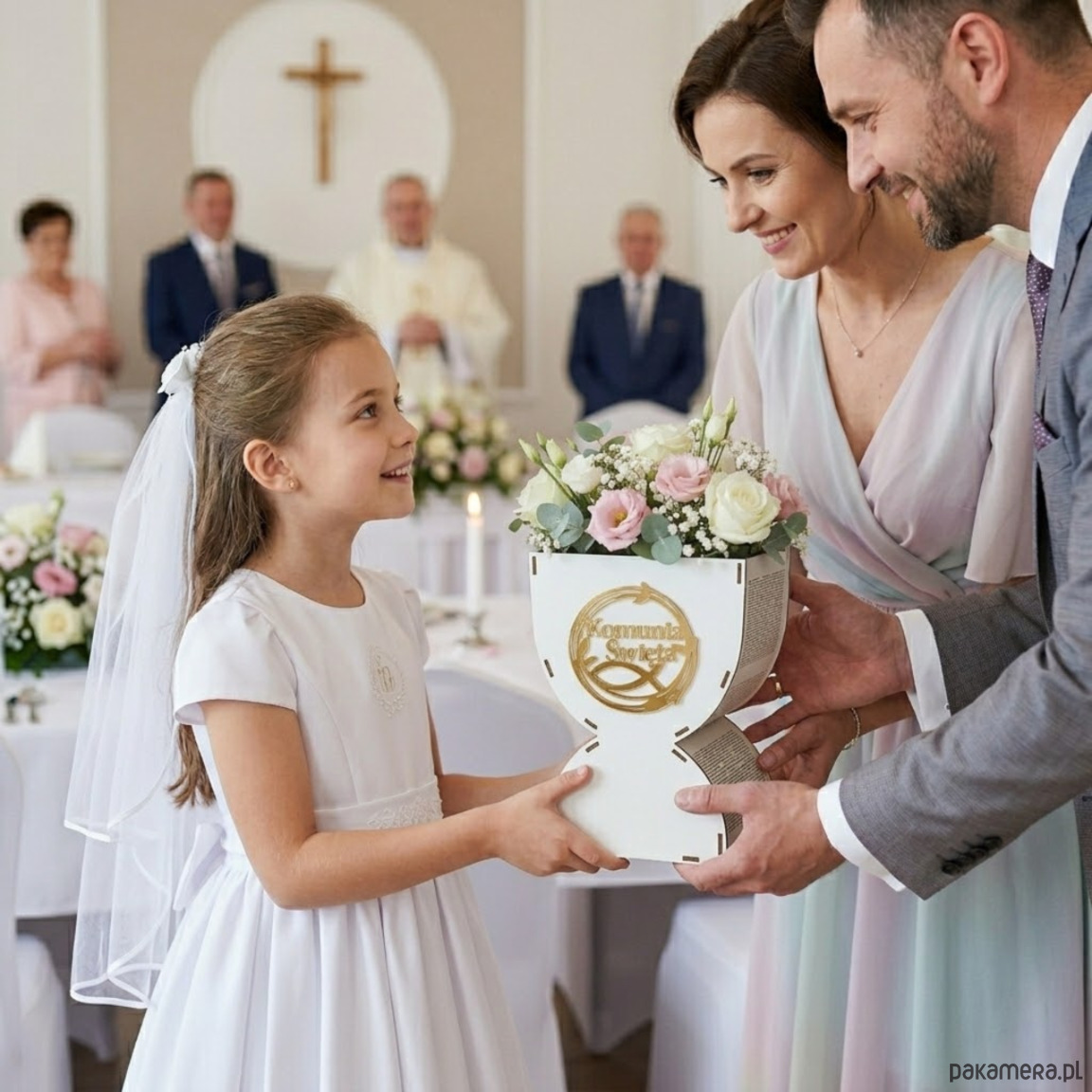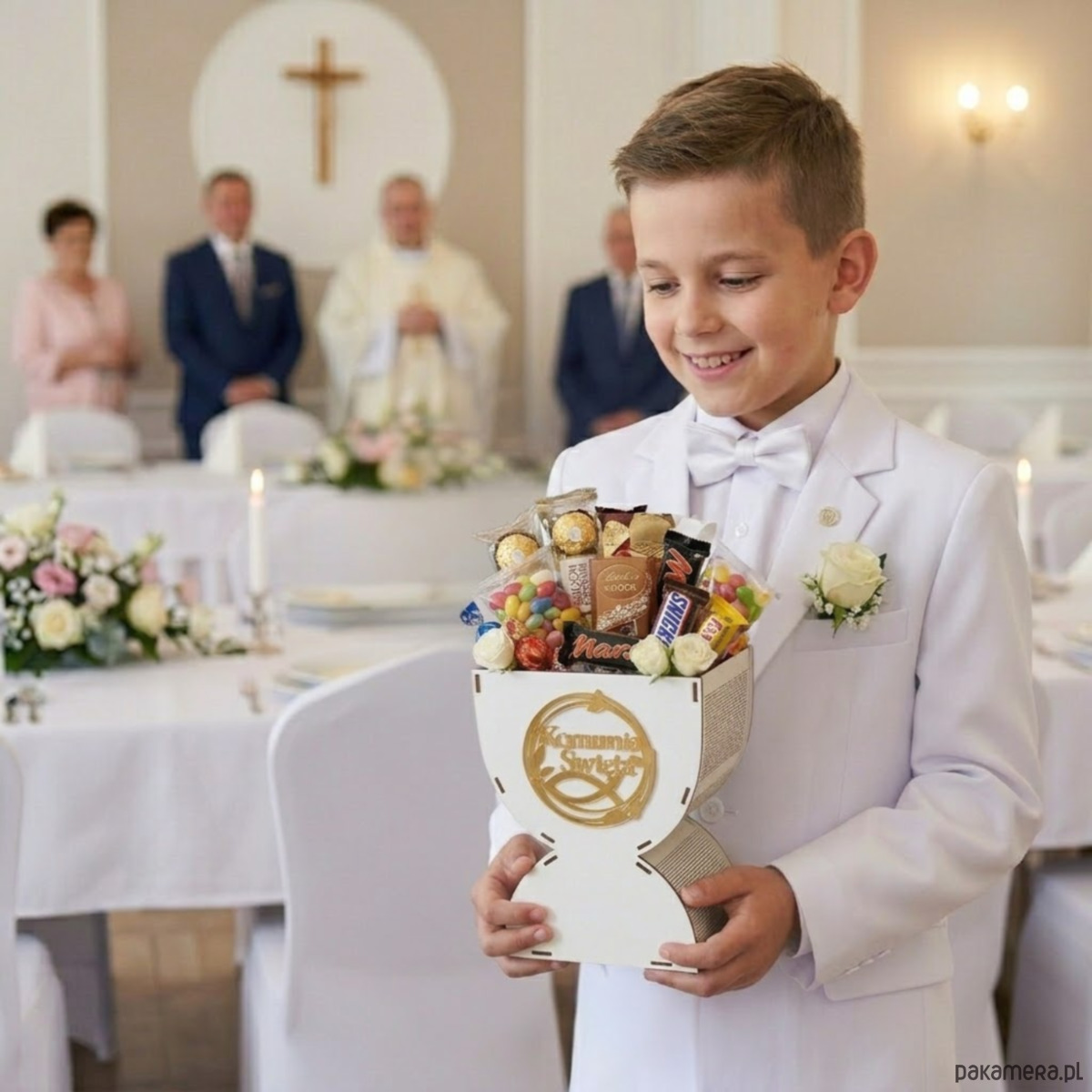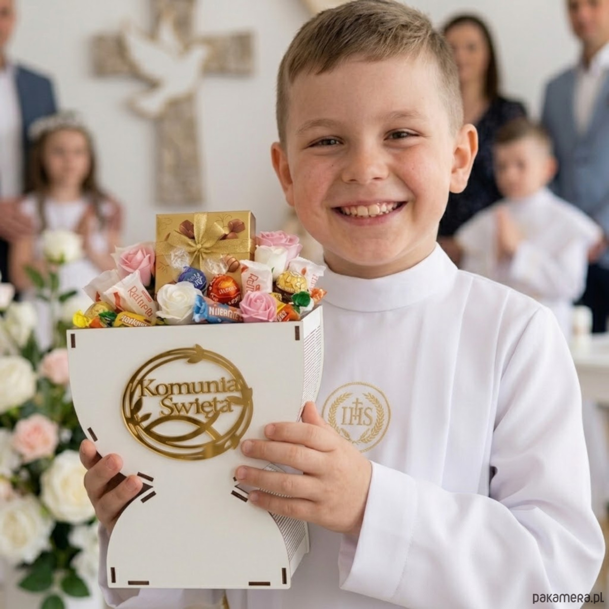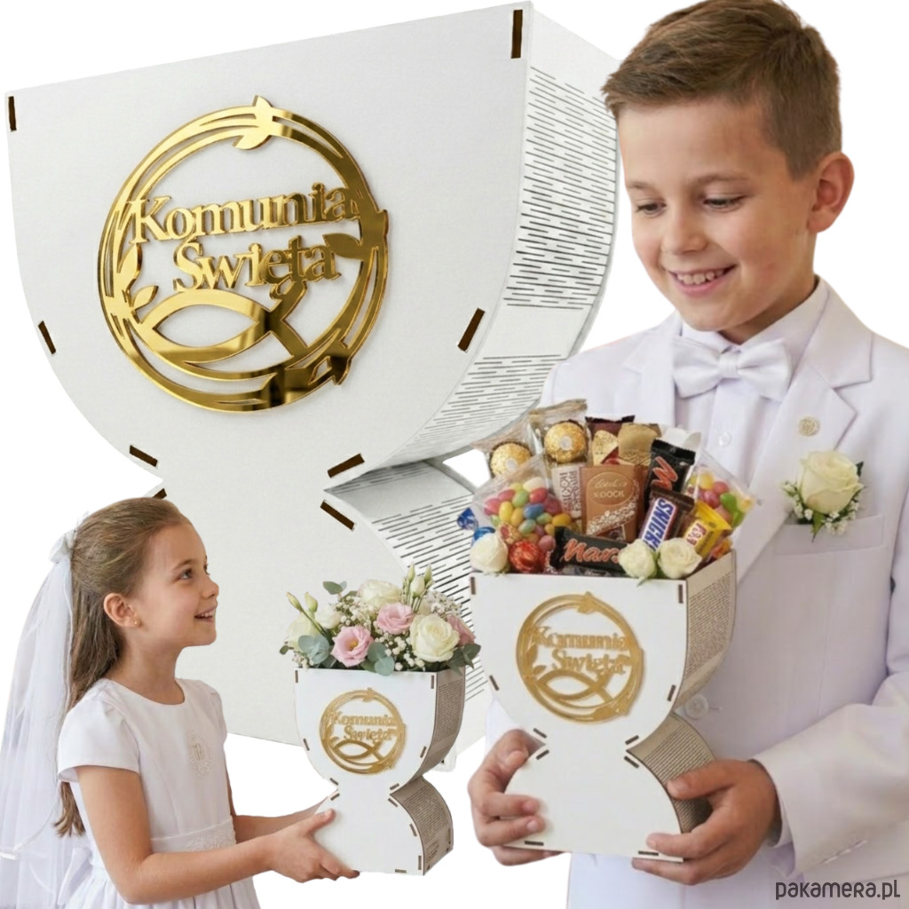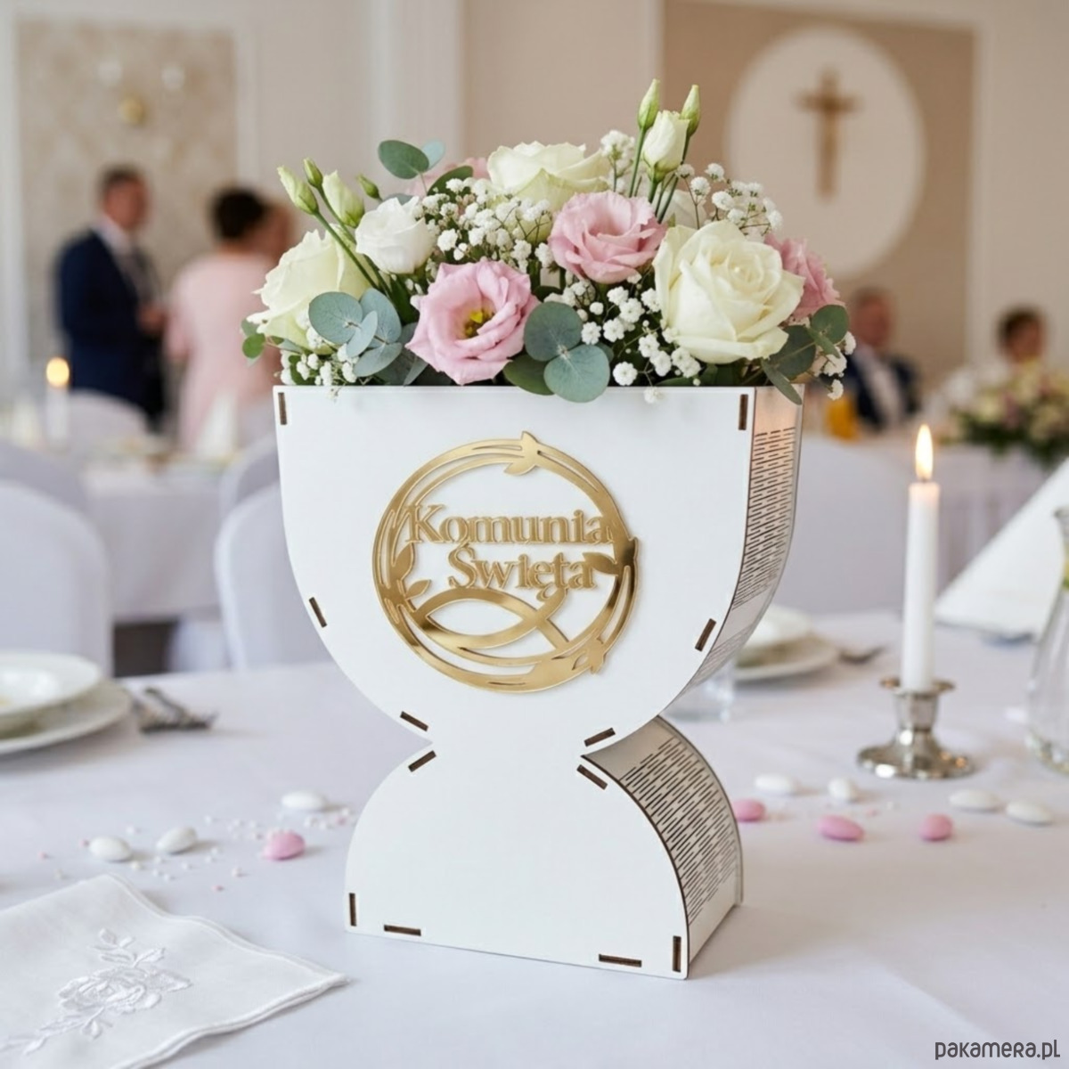 Eleganckie pudełko w kształcie kielicha wykonane z białej płyty HDF oraz dekoracyjnych elementów ze złotego lustrzanego plexi to wyjątkowa propozycja na Pierwszą Komunię Świętą. Połączenie bieli i złota nadaje mu uroczysty, luksusowy charakter, idealny na tak ważną okazję.To nie tylko dekoracja, ale również praktyczne pudełko na prezent lub słodycze, które pięknie uzupełnia komunijną aranżację stołu.