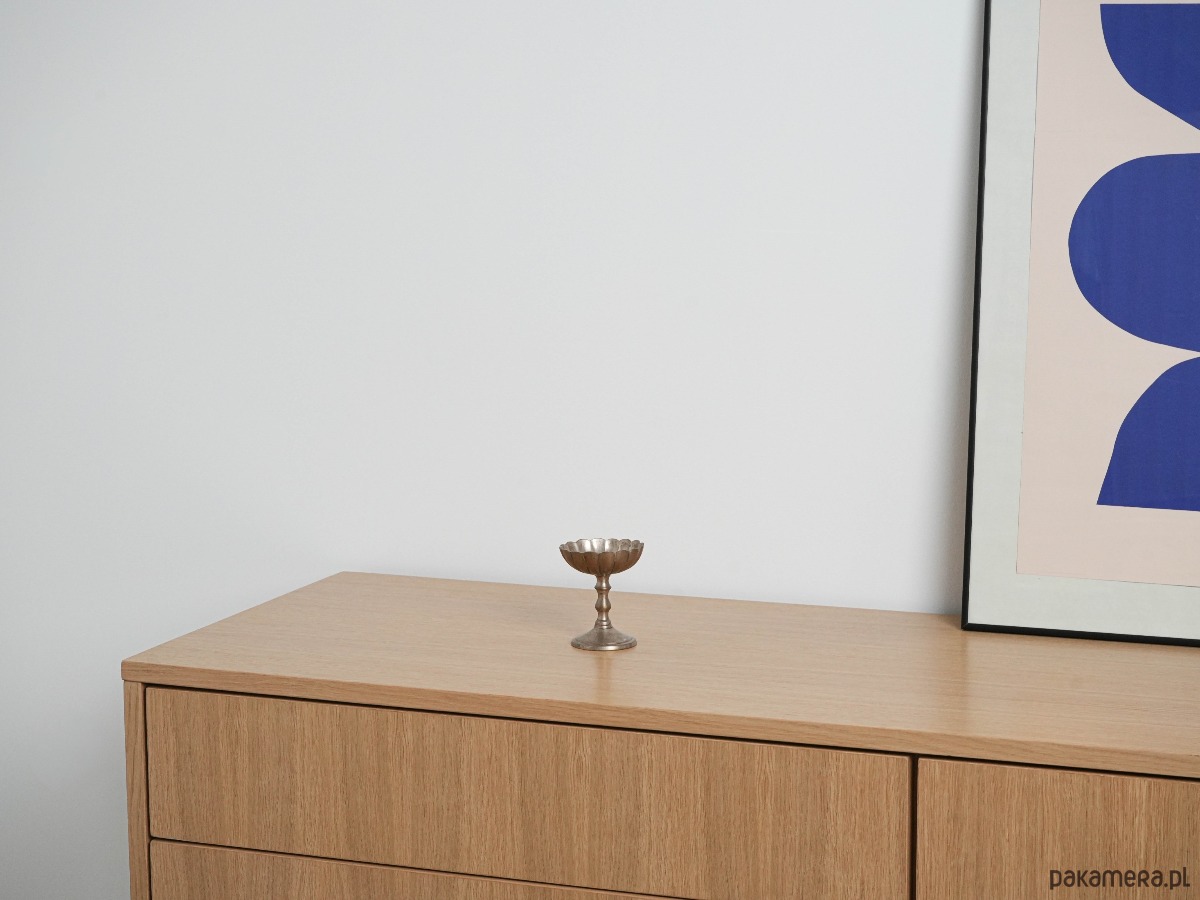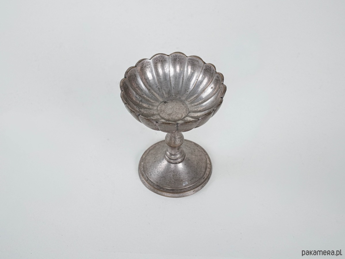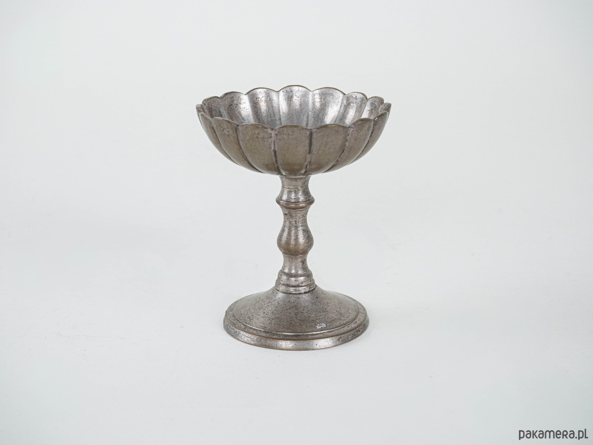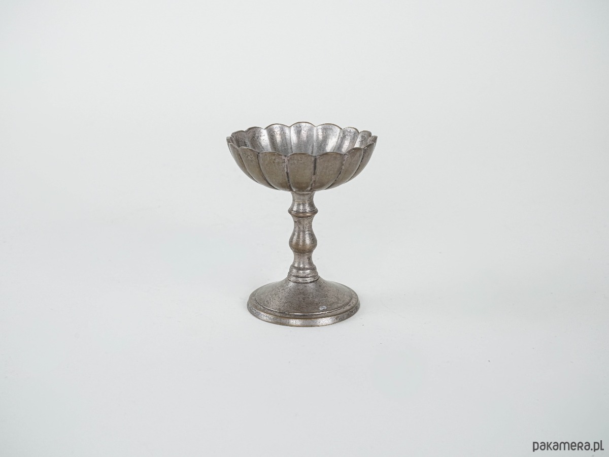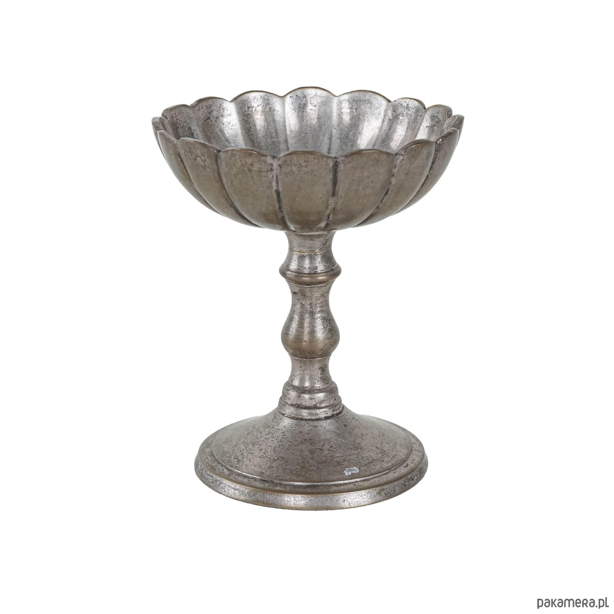 Metalowy pucharek dekoracyjny w formie kielicha z miseczką o muszlowym, żłobionym kształcie. Patynowana powierzchnia podkreśla jego elegancję i vintage’owy charakter. Może pełnić funkcję naczynia na drobiazgi, biżuterię lub jako element ozdobny.