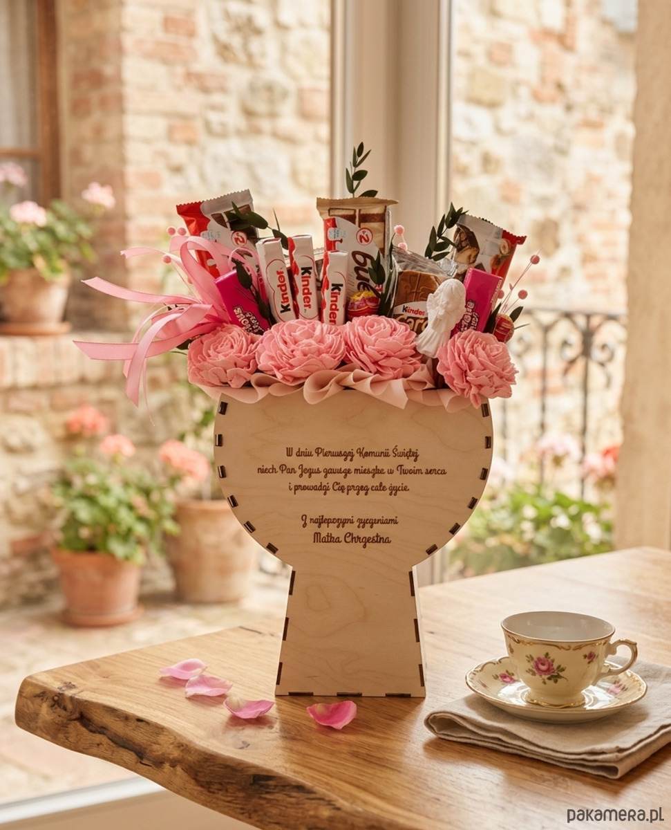 Kielich flowerbox komunijny ze słodyczami prezent personalizowany na Komunię